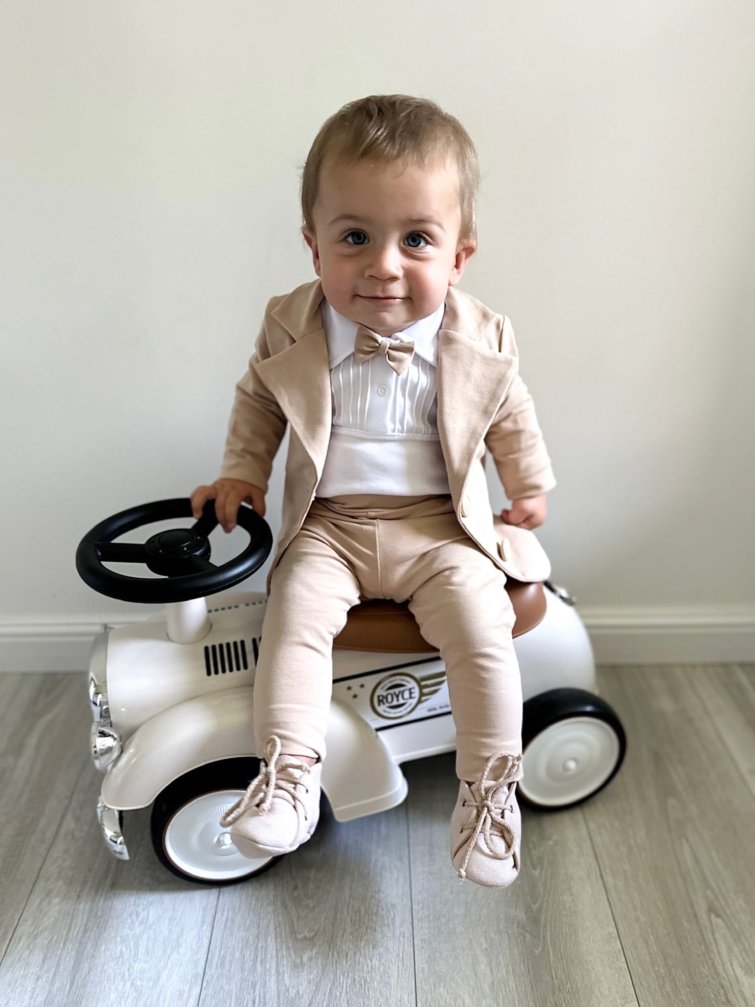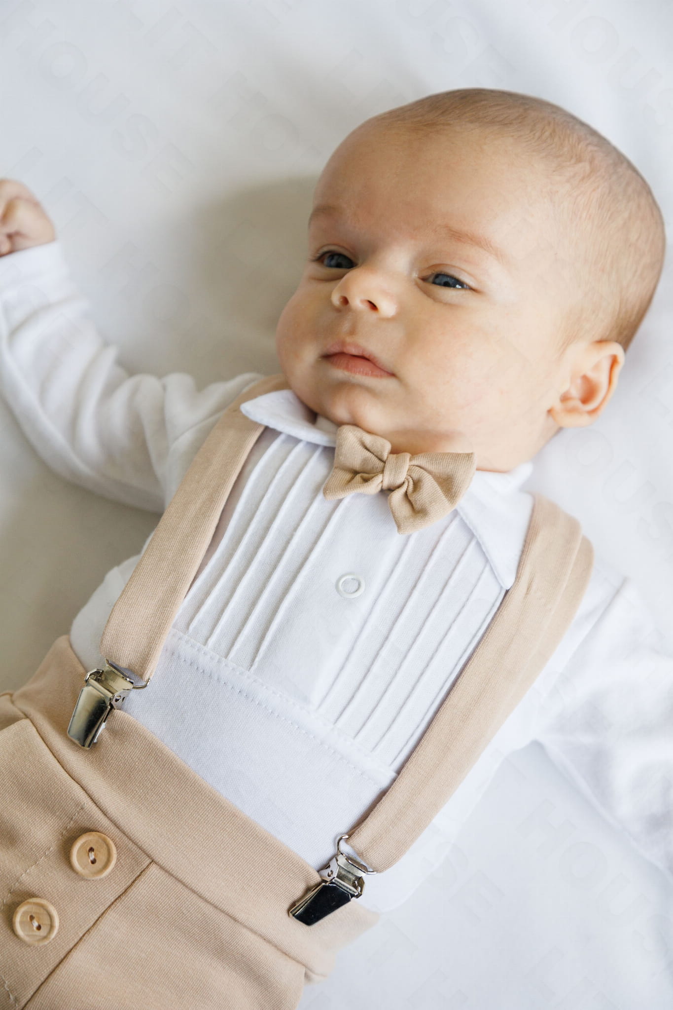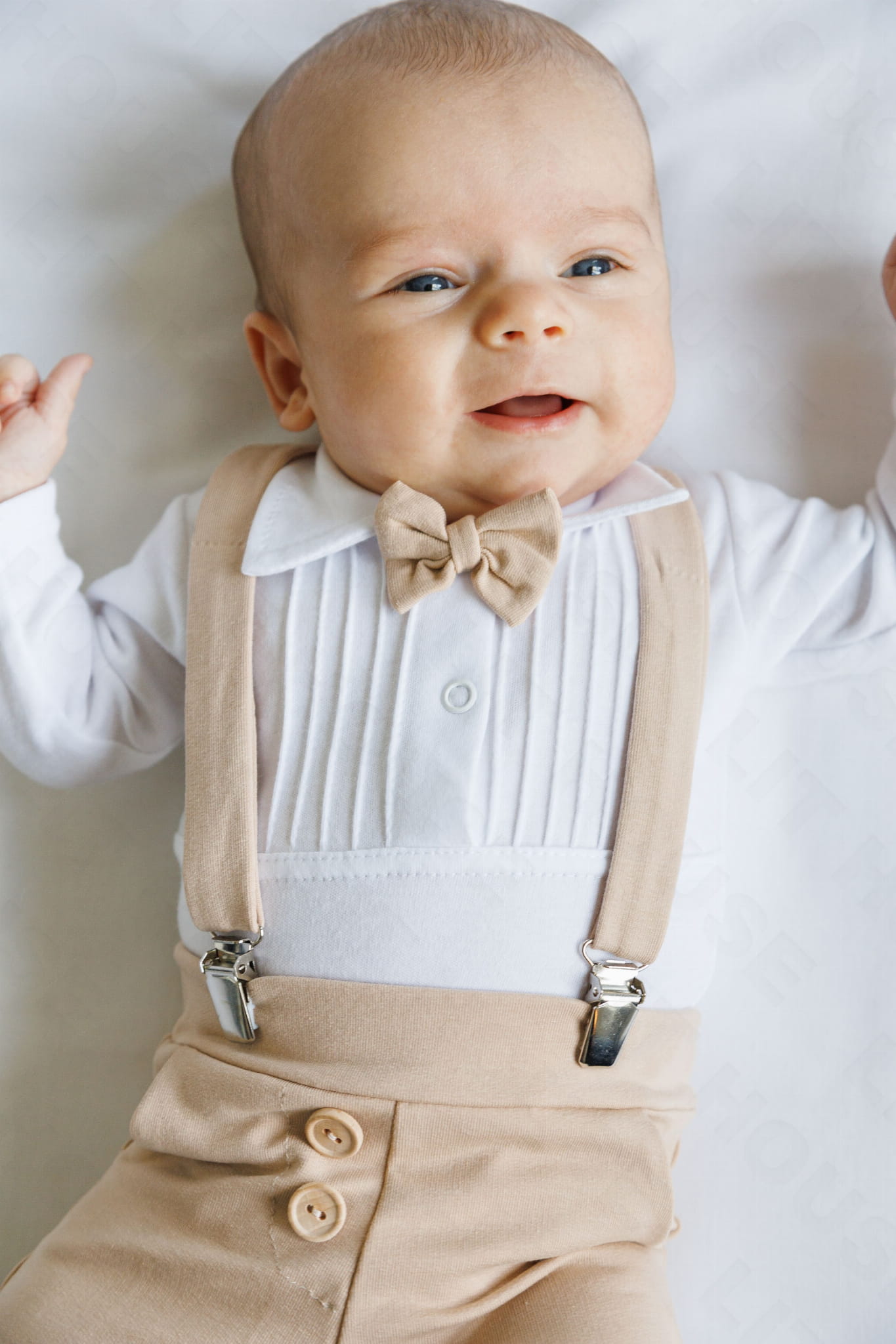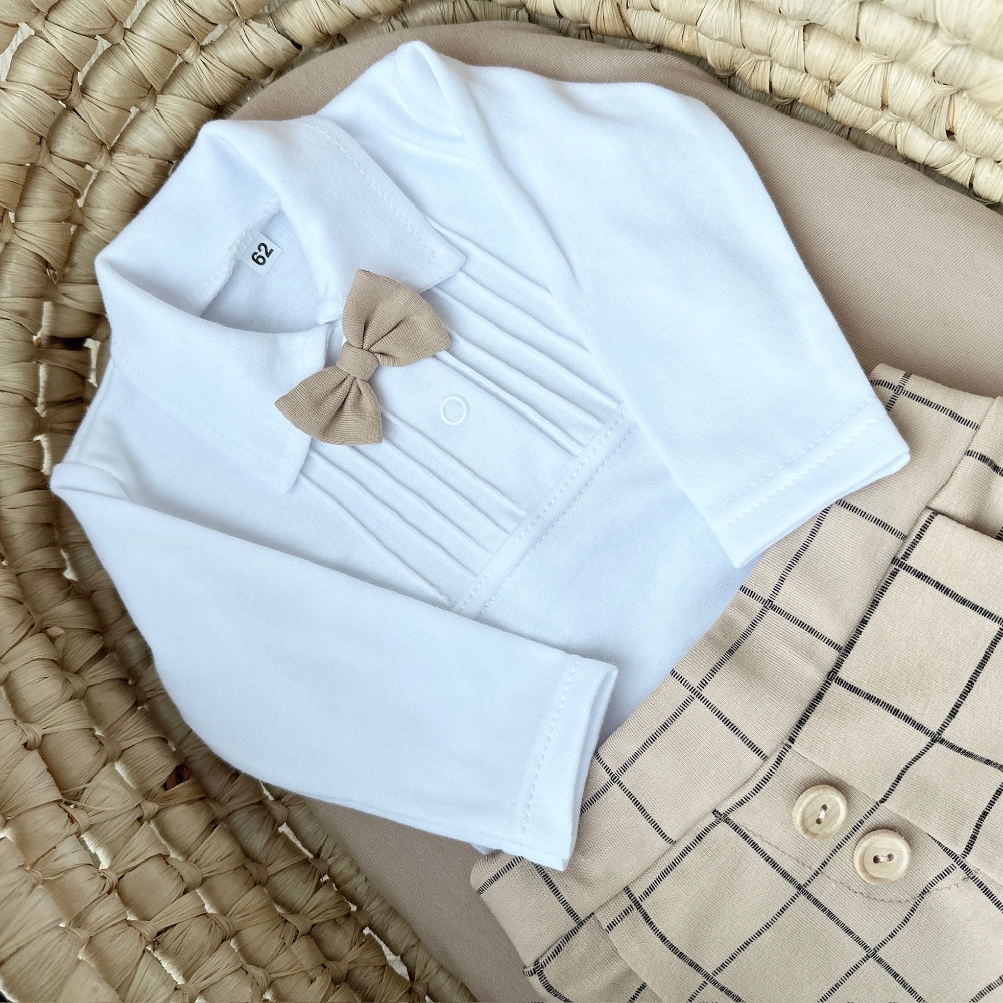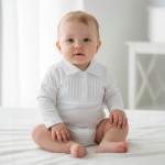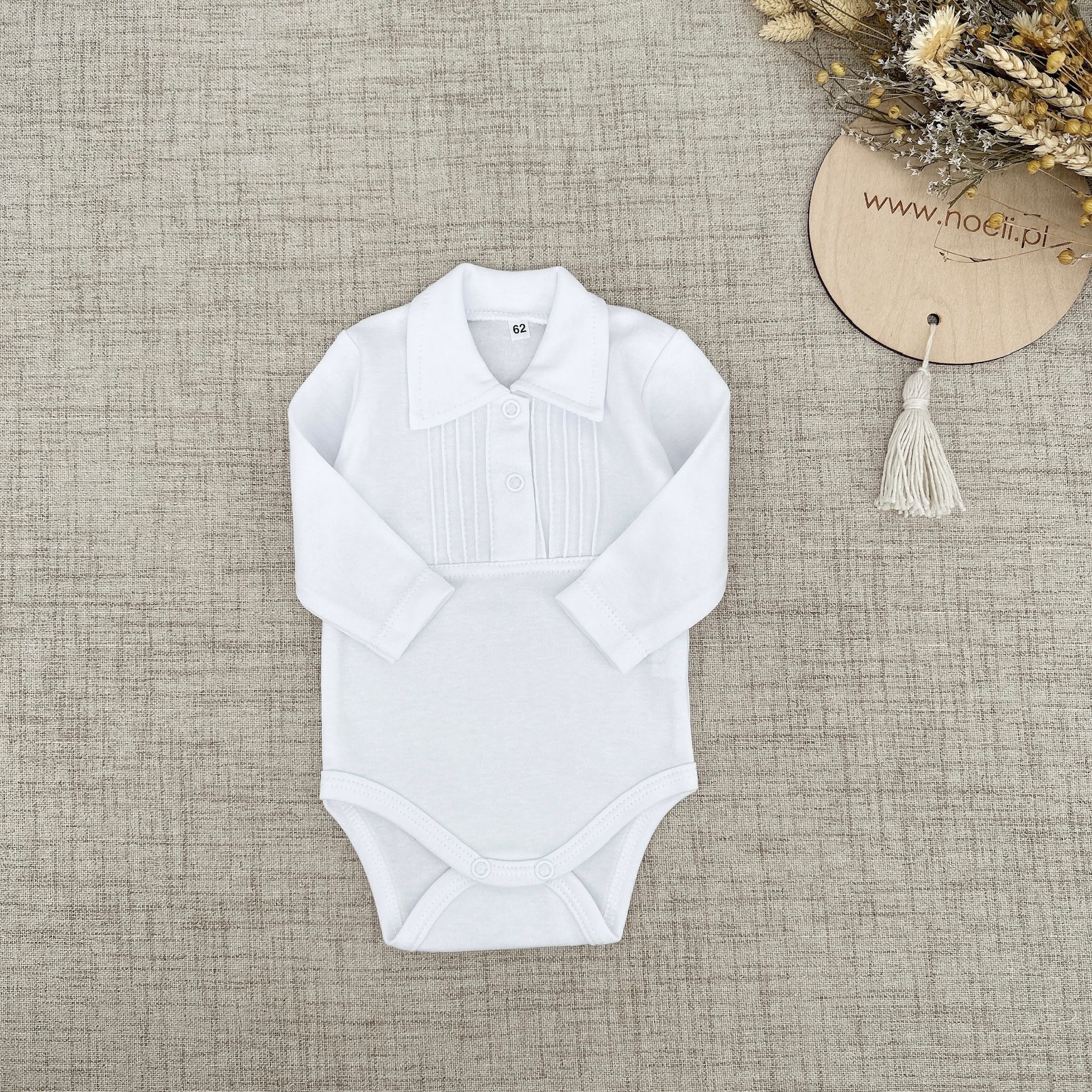 Białe body z bawełny z długim rekawkiem zdobione plisami, mięciutkie i rozciągliwe, z kolnierzykiem, który jest miły w dotyku, nie uwiera. Muszka do kupienia w osobnej pozycji.
