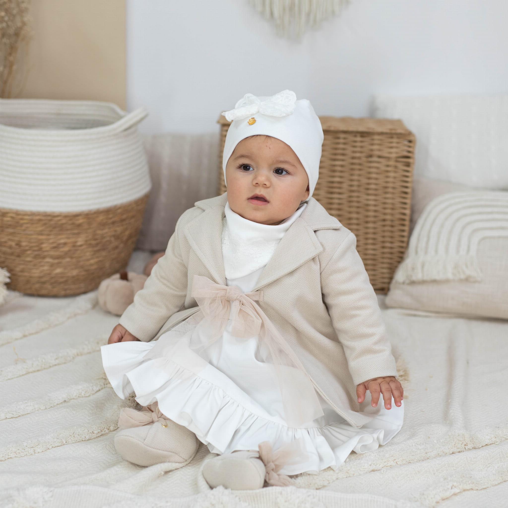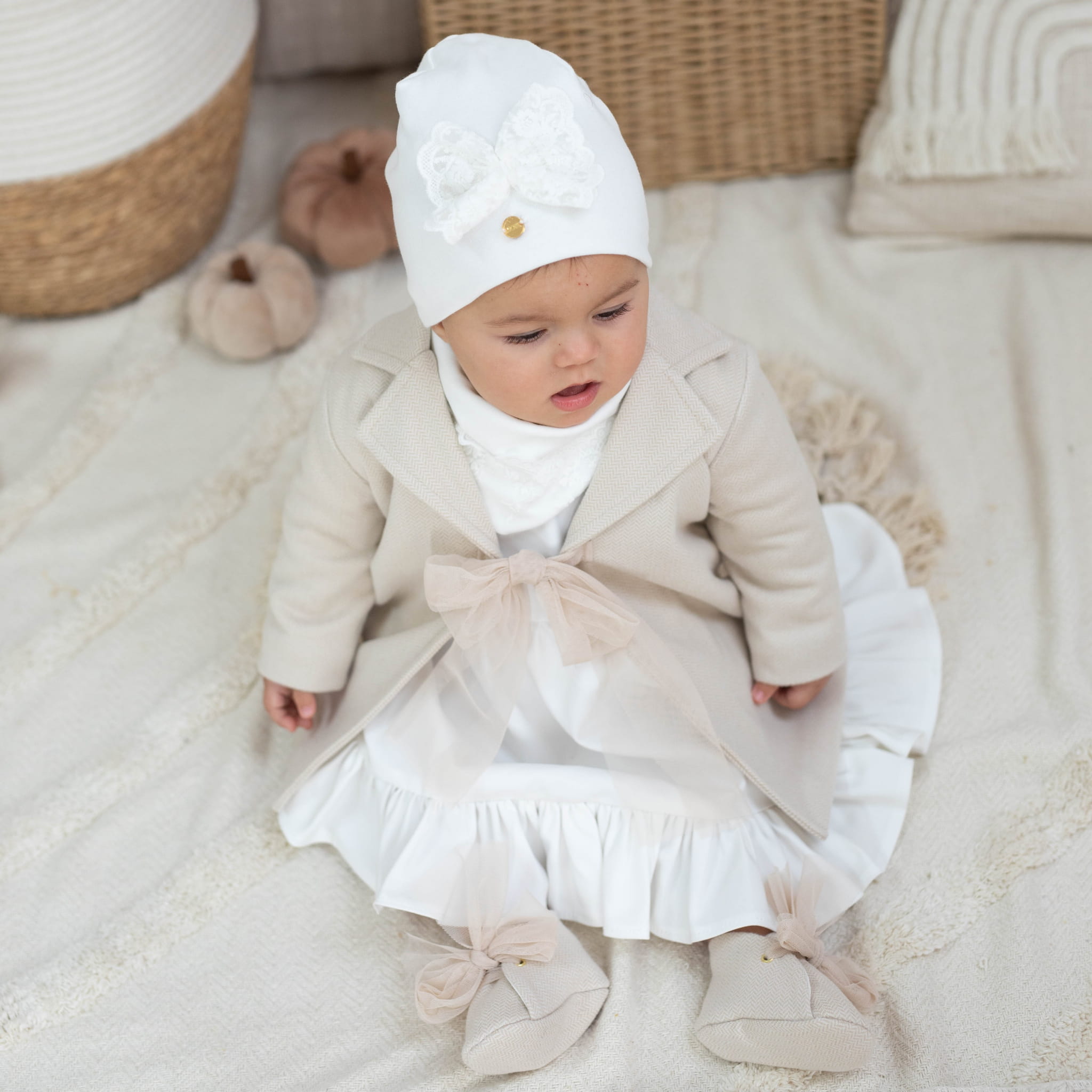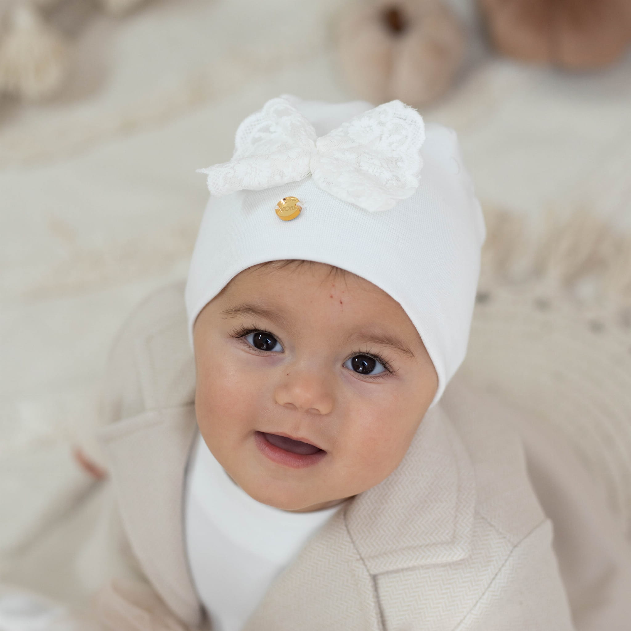 Czapka do chrztu z miekkiej bawełny z kokarda z koronki ecru Molly