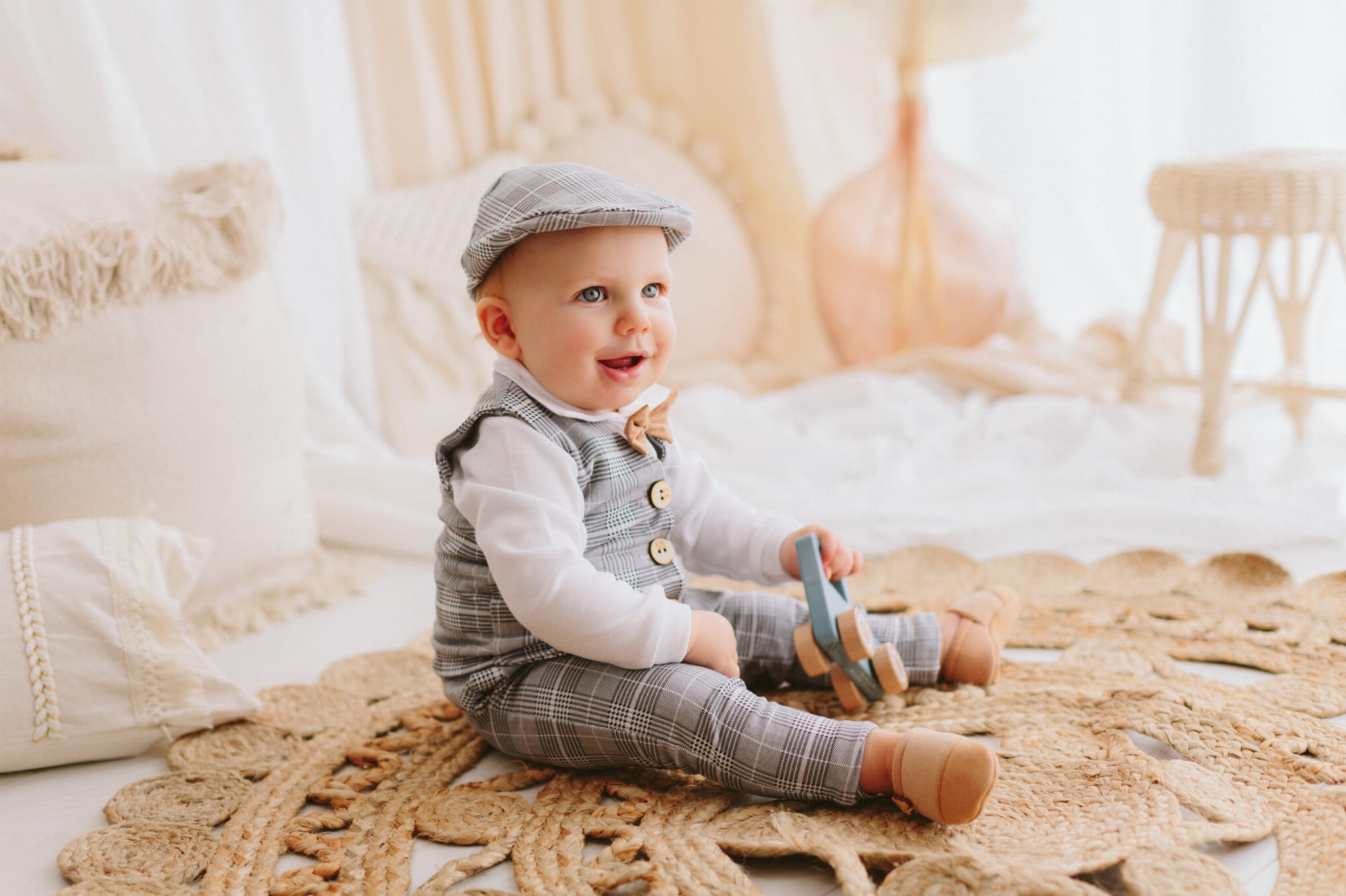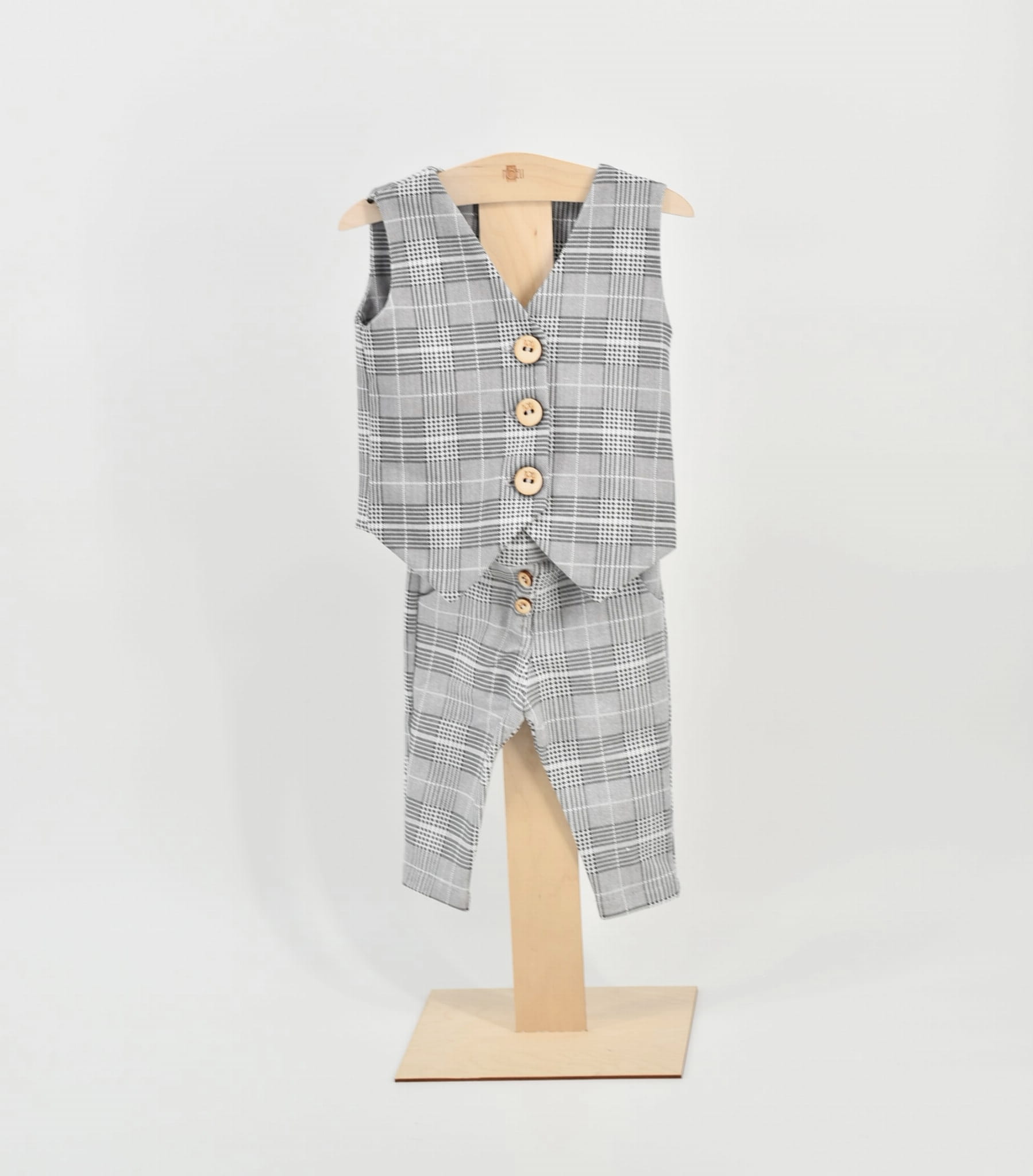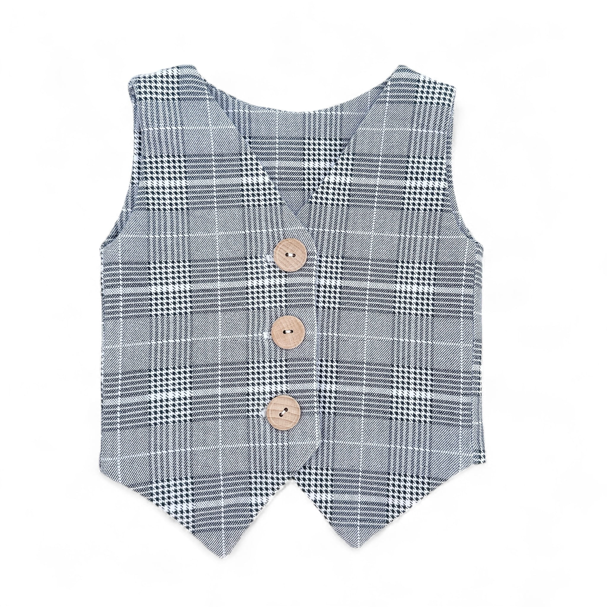 Kamizelka dla chłopca z dzianiny bawełnianej premium w kolorze szarym w kratę.