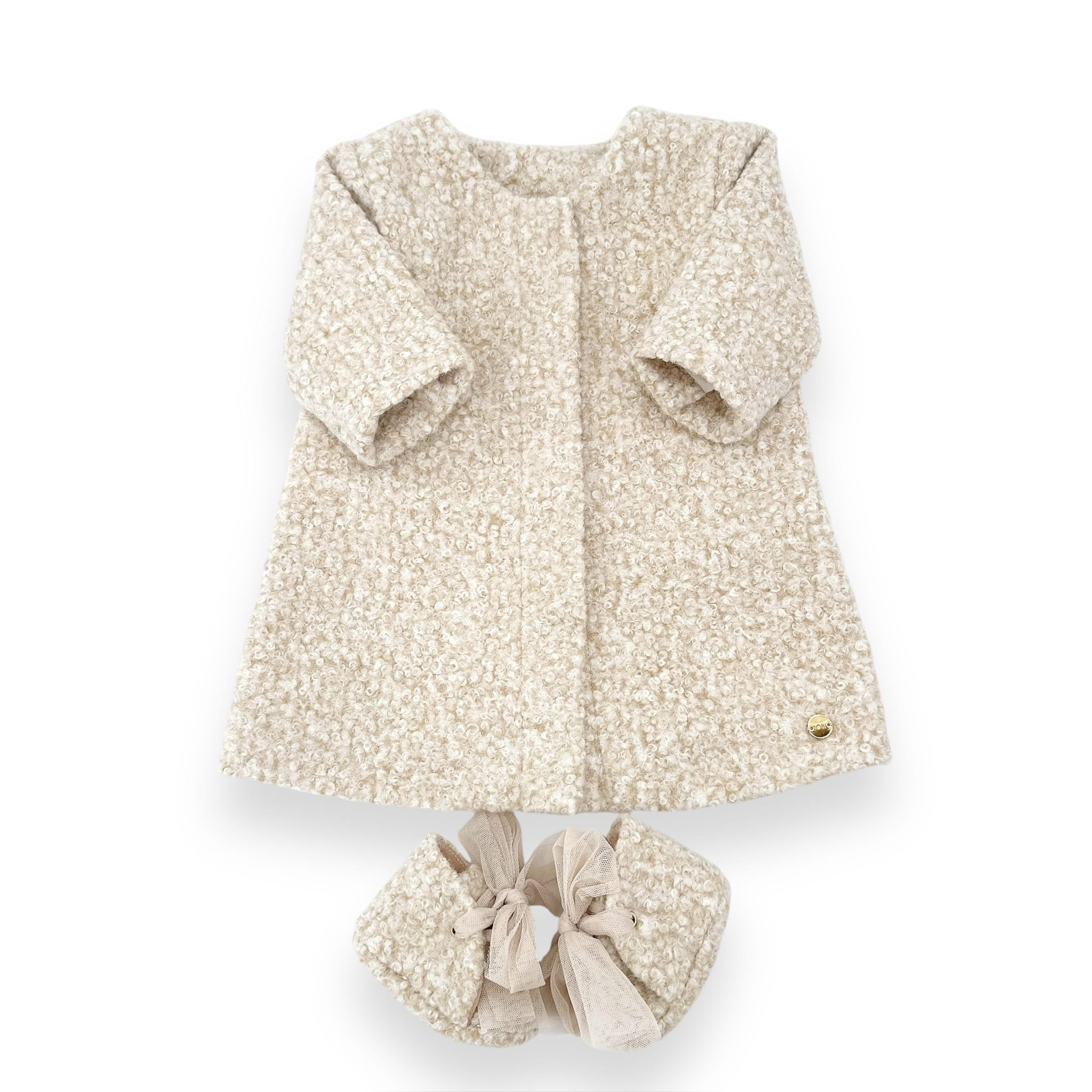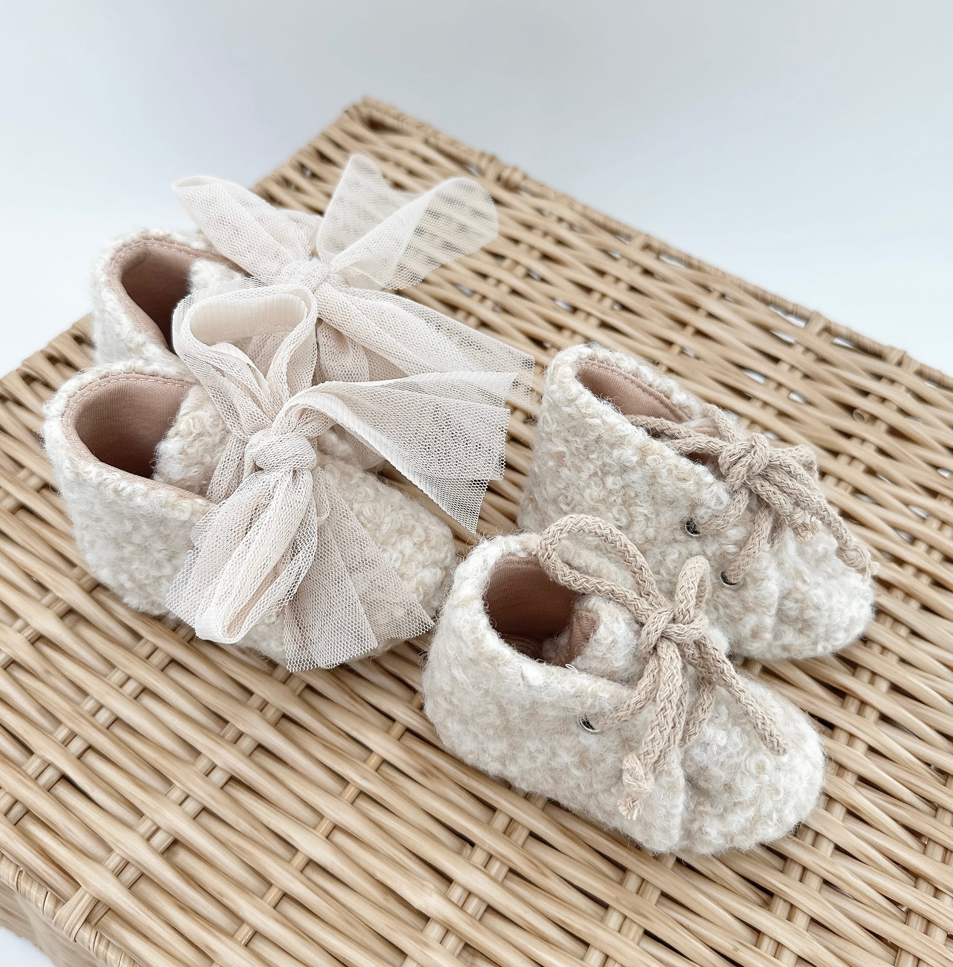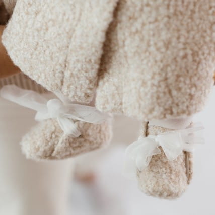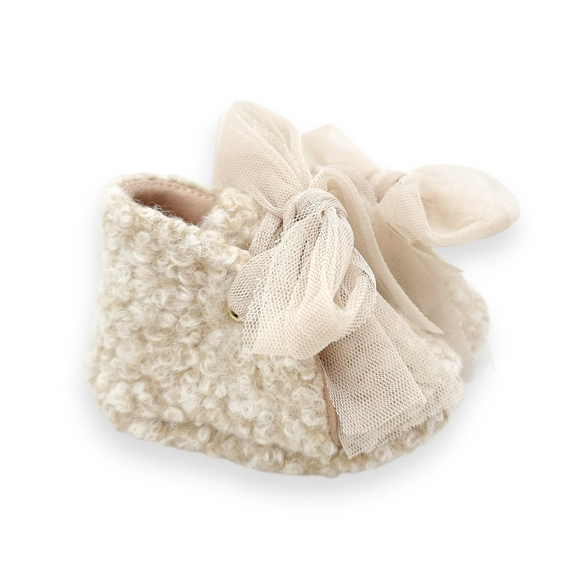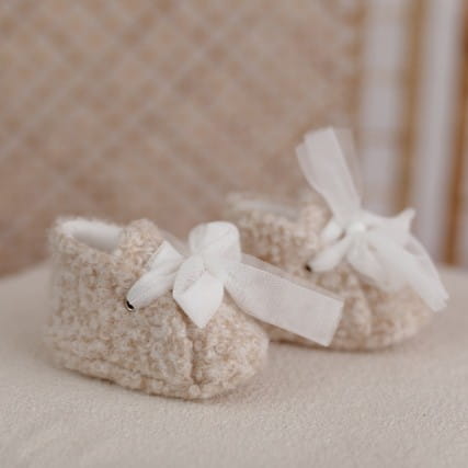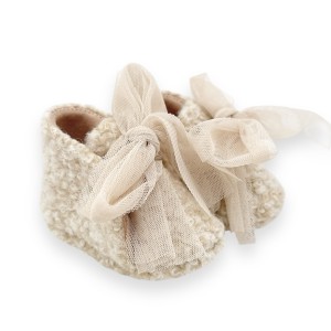 Buciki do chrztu, niechodki, trzewiczki dla dziewczynki z miekkiej wełnianej tkaniny w kolorze beż melanż kokardą, rozmiar to długość stopki w cm