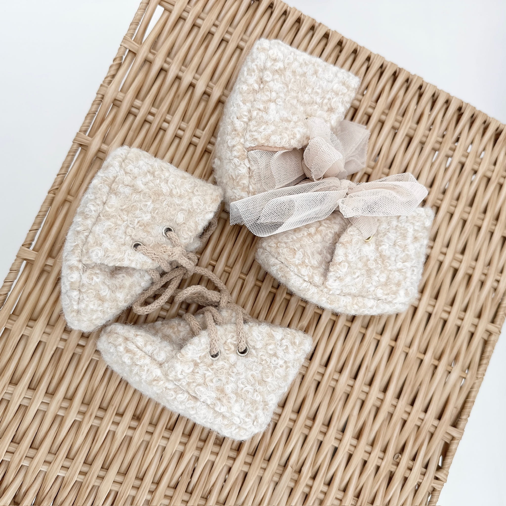 Buciki do chrztu niechodki trzewiczki beż melanż z wełny wiązane