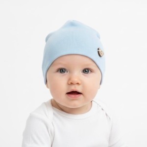 Czapka dla chłopca z podwojnej warstwy mocno rozciagliwej bawełny sciagaczowej zdobiona misiem w kolorze niebieskim błękitnym