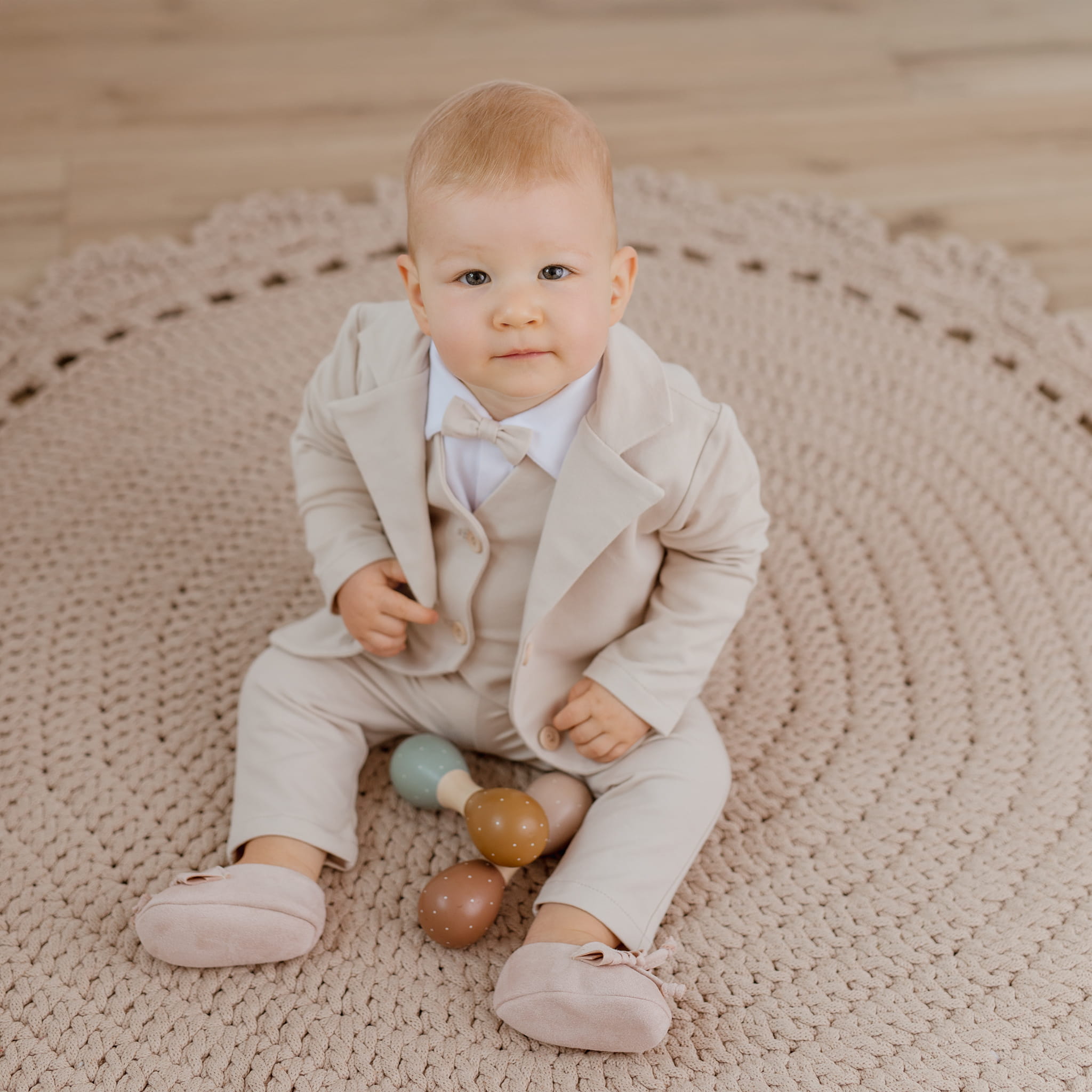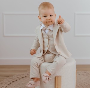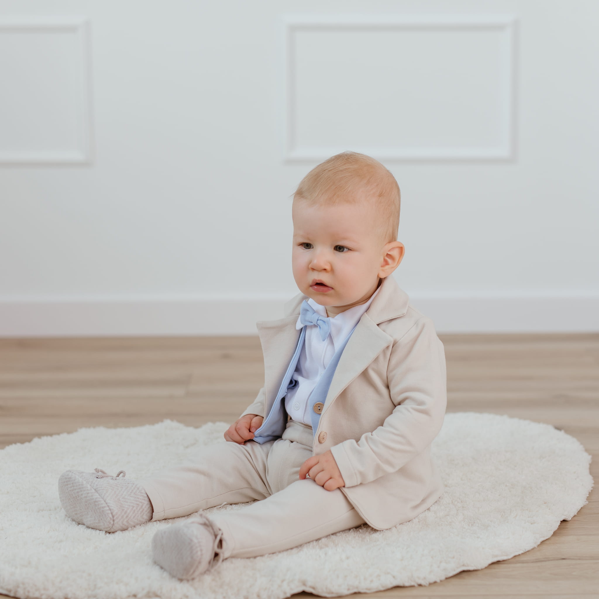 Zestaw ubranek w rozmiarze 68 dla chłopca szyty ręcznie garnitur 2 częściowy z miękkiej polskiej dzianiny bawełnianej premium z drewnianymi guziczkami.