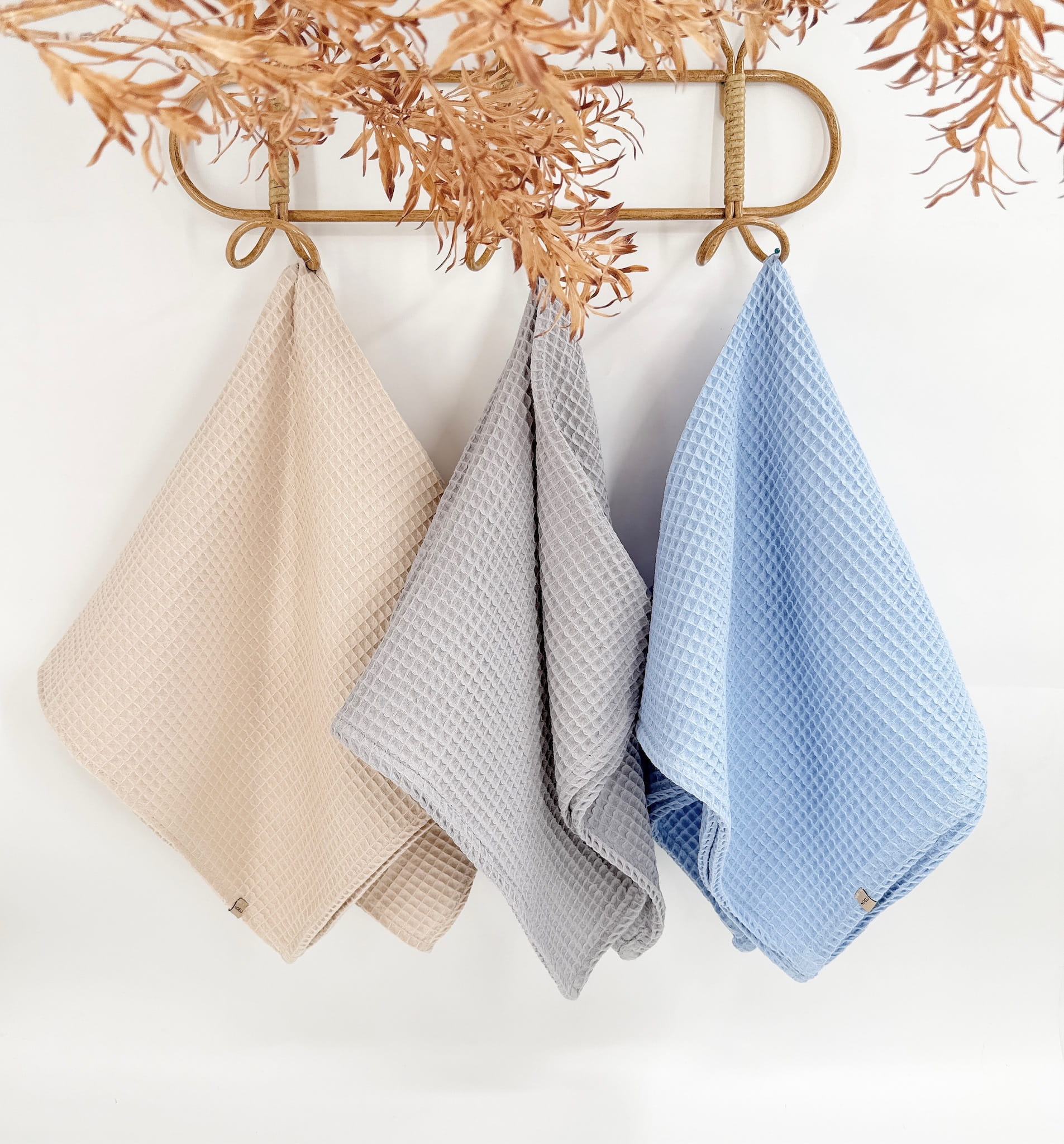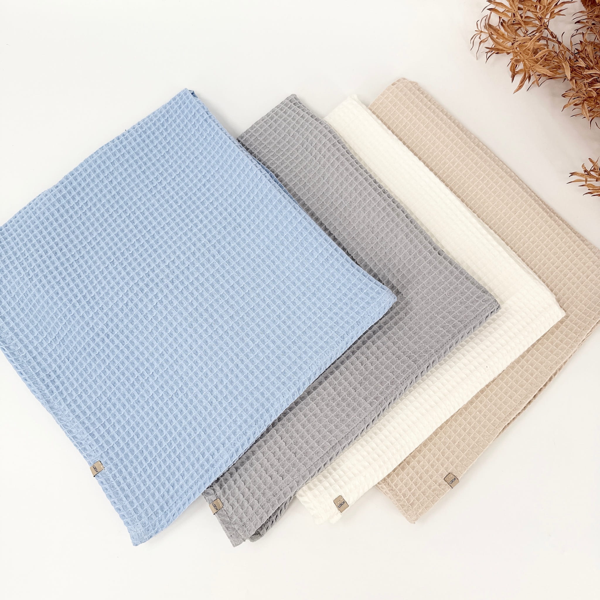 Kocyk otulacz z wafla bawełnianego w kolorze jasny błękit. Wymiary 70x70cm