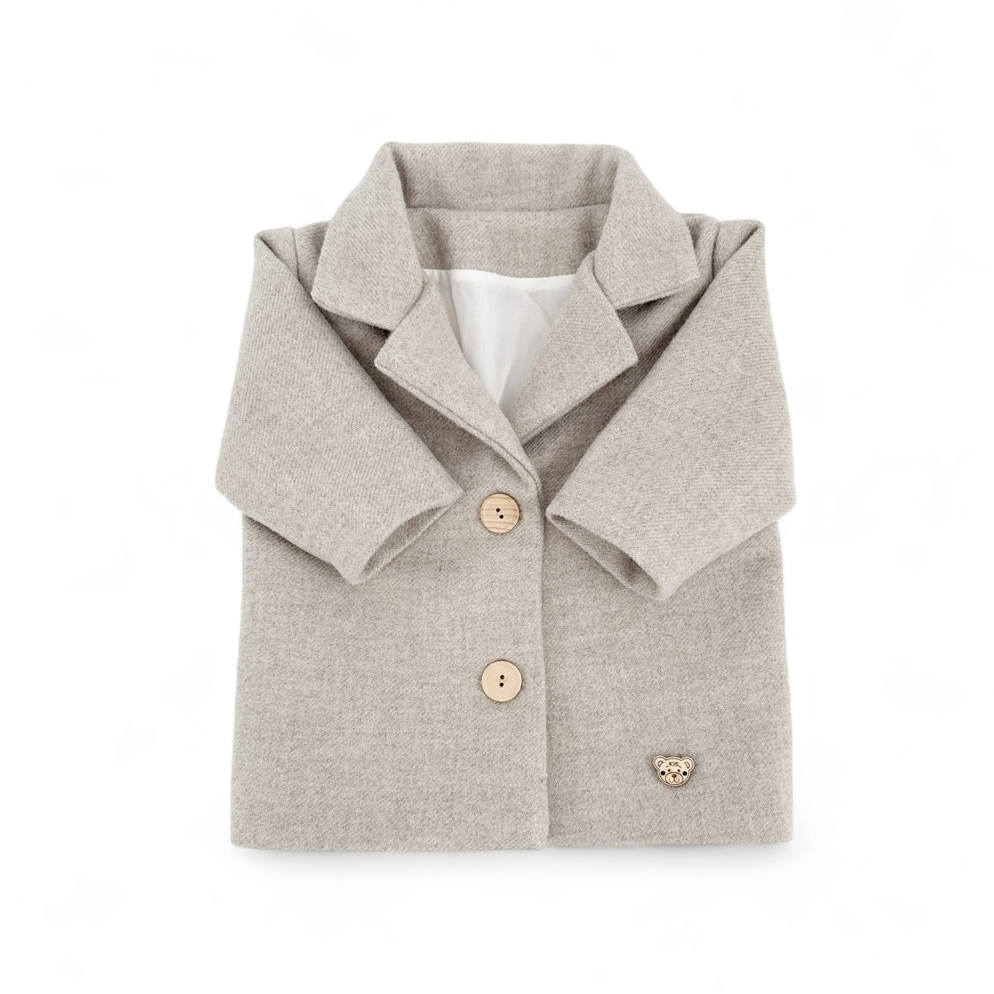 Płaszczyk do chrztu i nie tylko z płaszczowego flauszu ,kolor piaskowy szary beż, z wiskozową podszewką. Zapinany na drewniane guziczki. Płaszczyk jest odpowiedni na temperatury powyżej 10 stopni