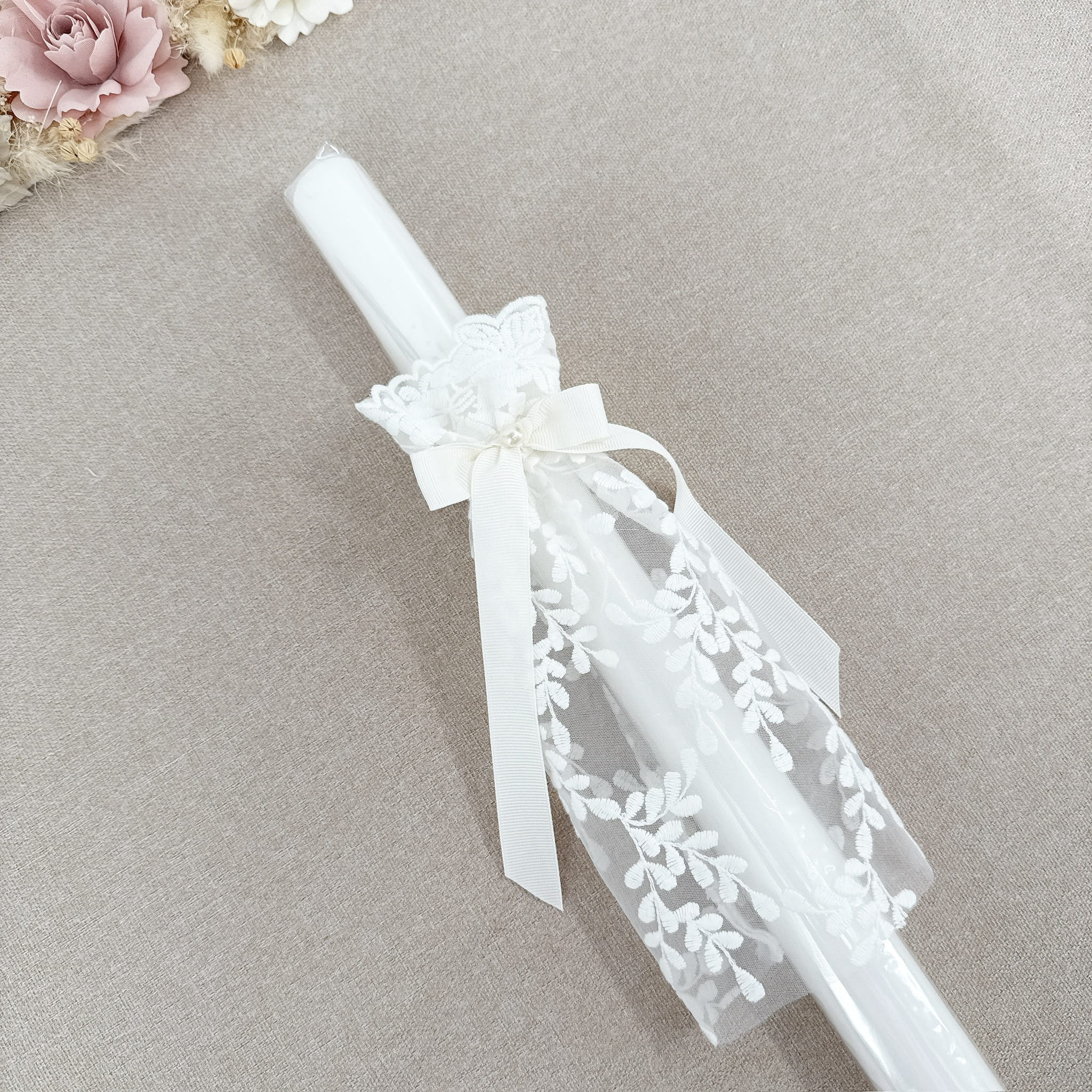 Profitka na świecę do Chrztu ,ozdoba wykonana z tiulu ecru i koronki ecru Margaret tej samej z ktorej powstaja nasze sukienki
