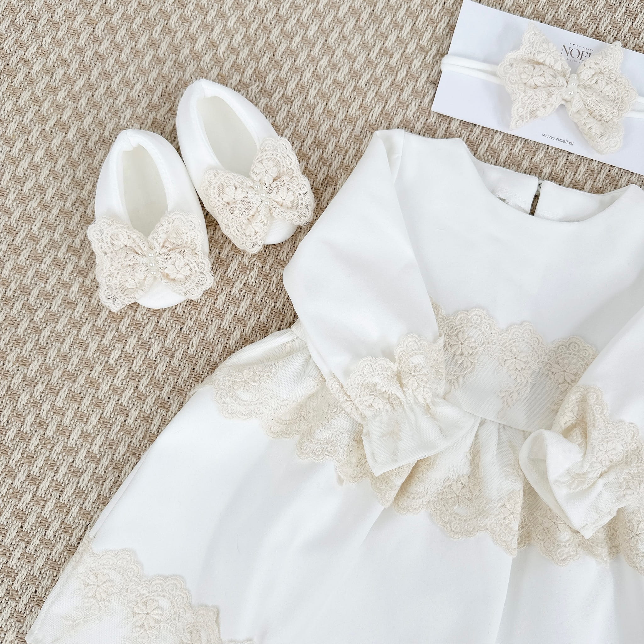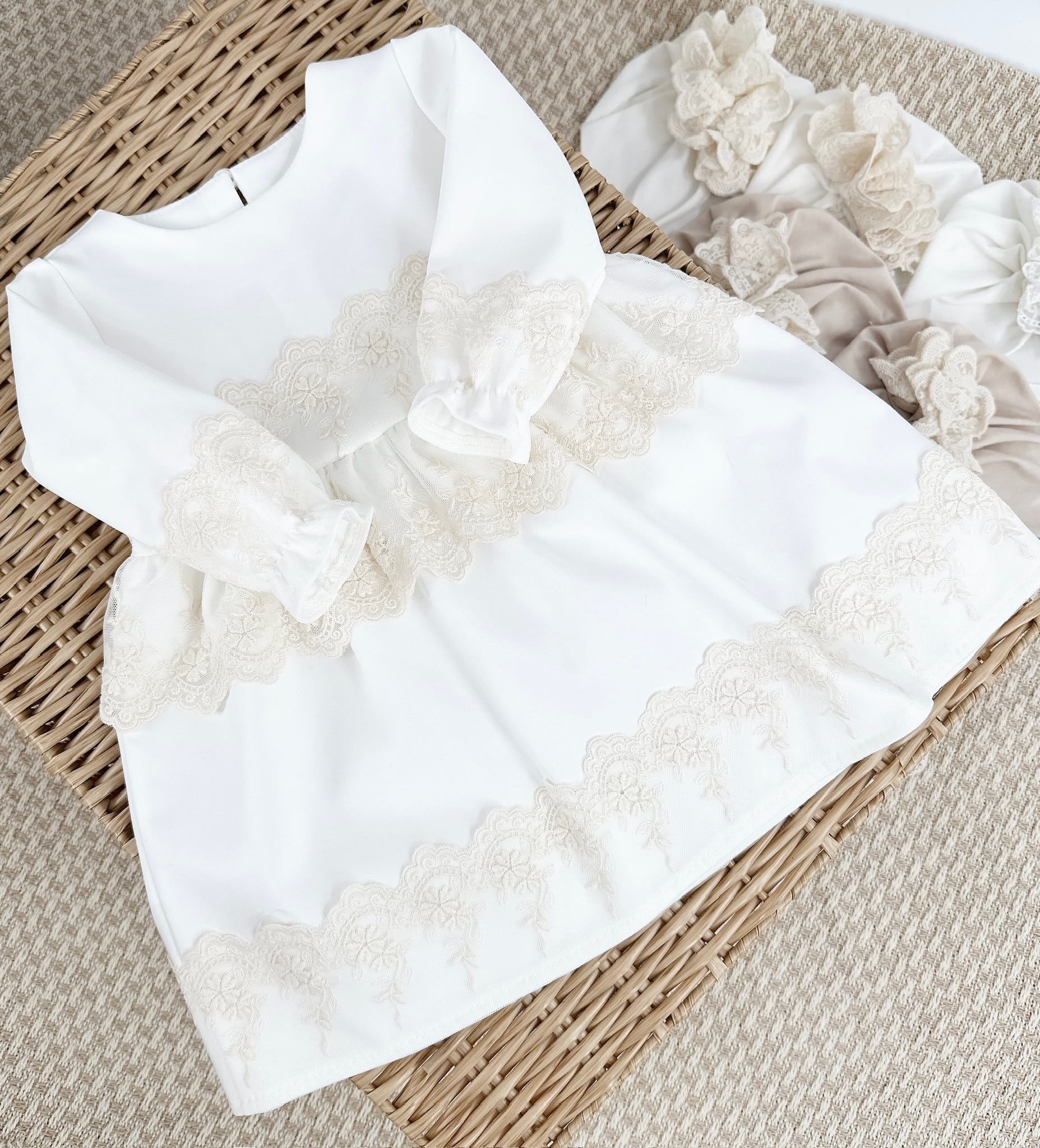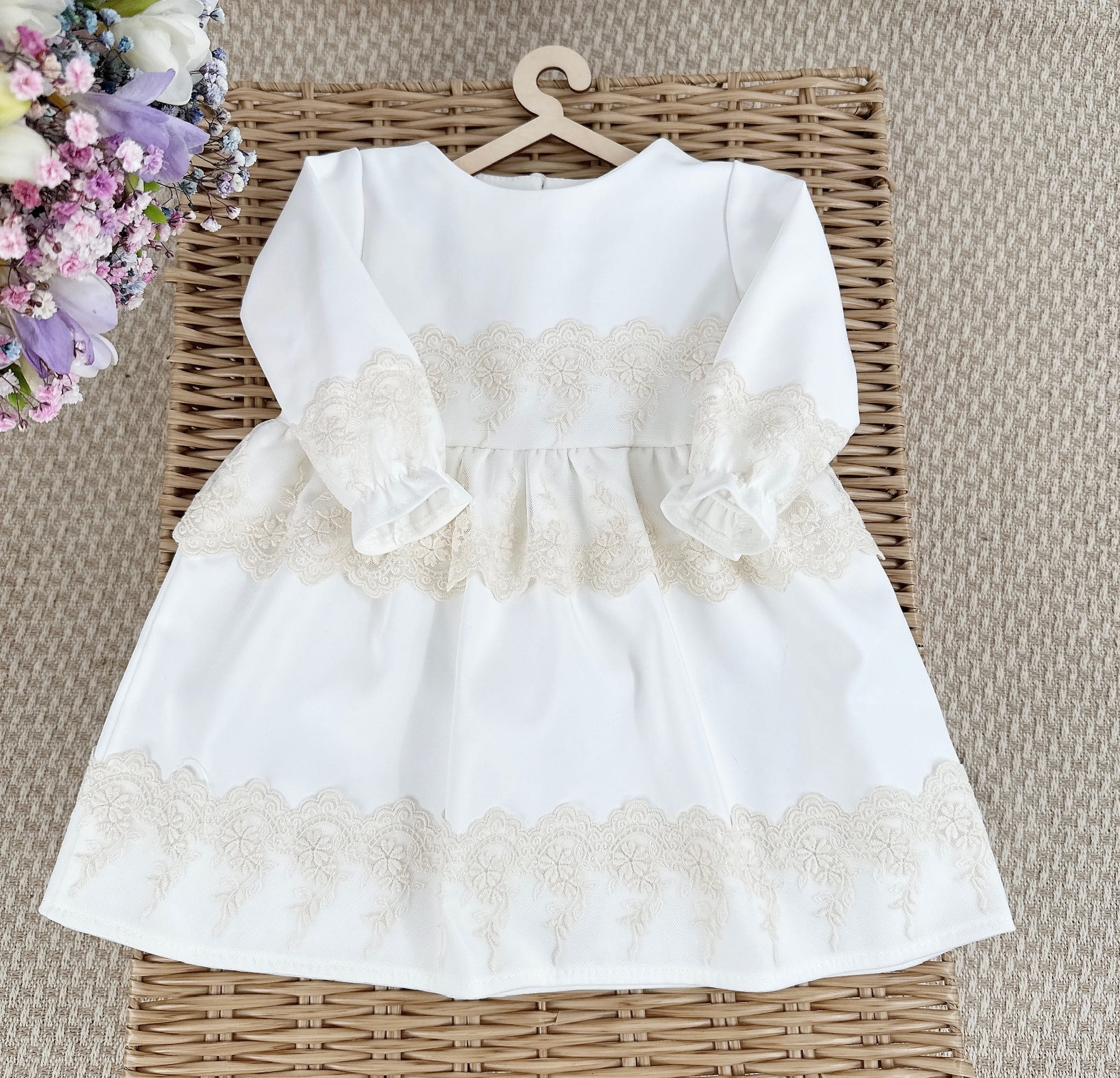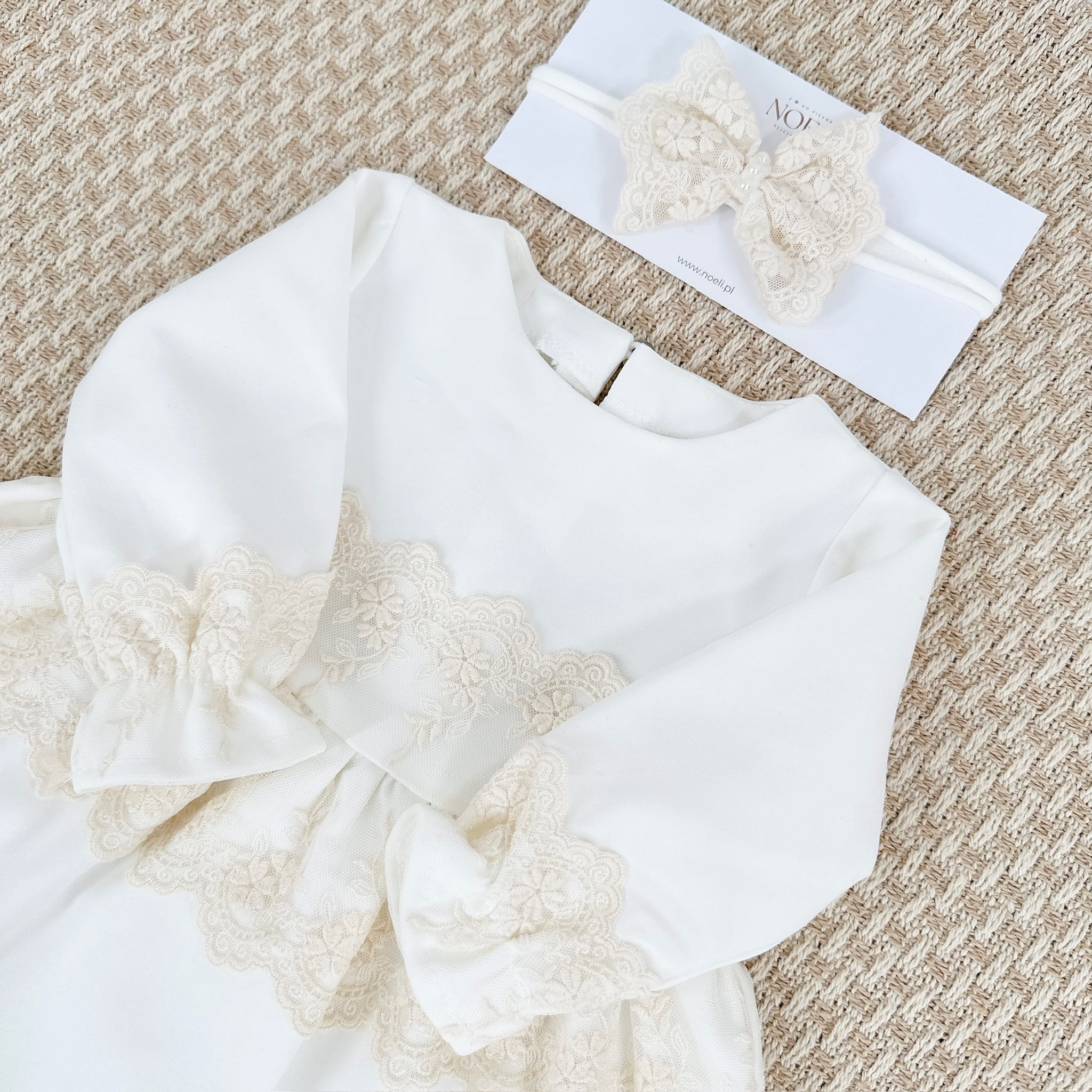Sukienka do chrztu Matylda ecru zdobiona delikatnym tiulowym haftem beżowym, wykonana z matowej szlachetnej bawełny premium lekko rozciagliwej, zapinana na guziczek z tyłu.