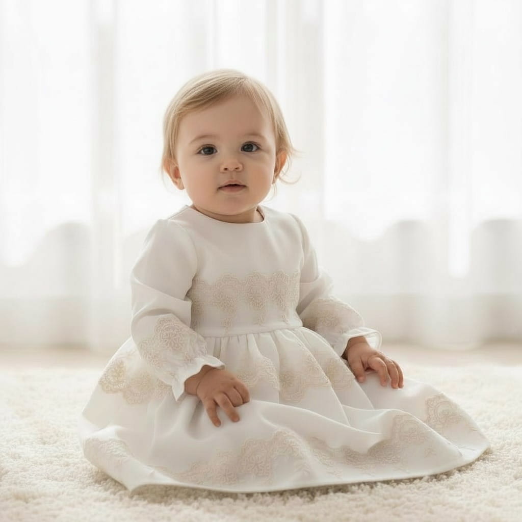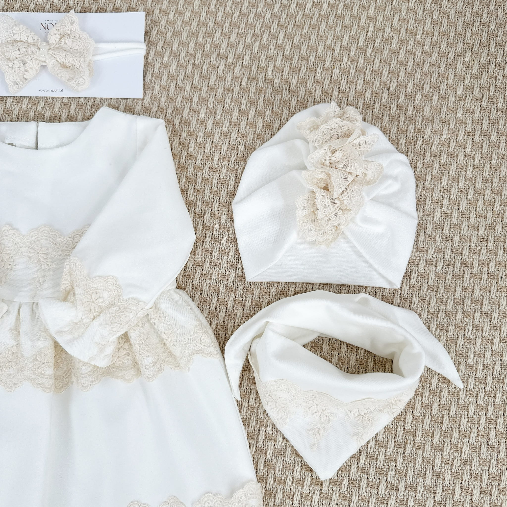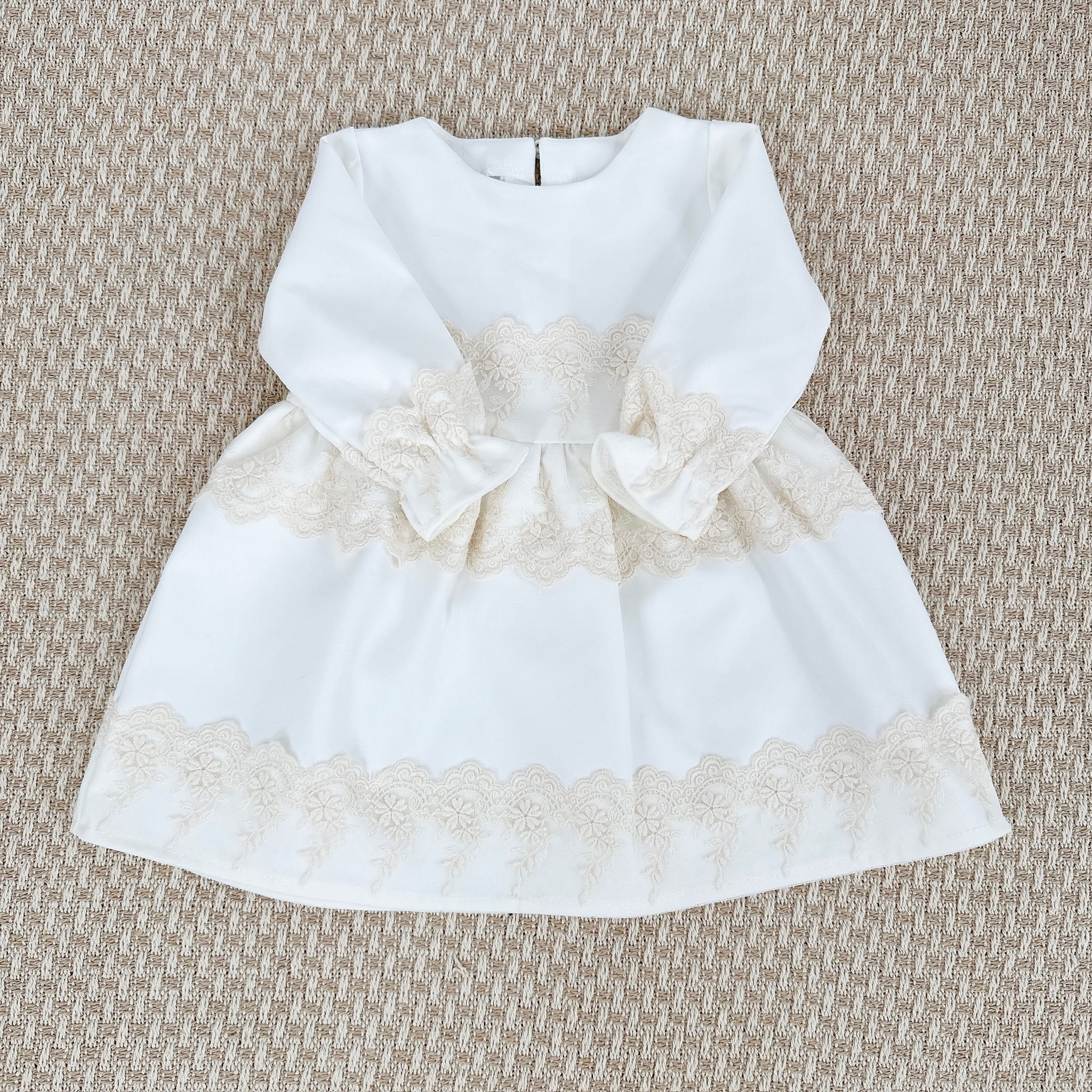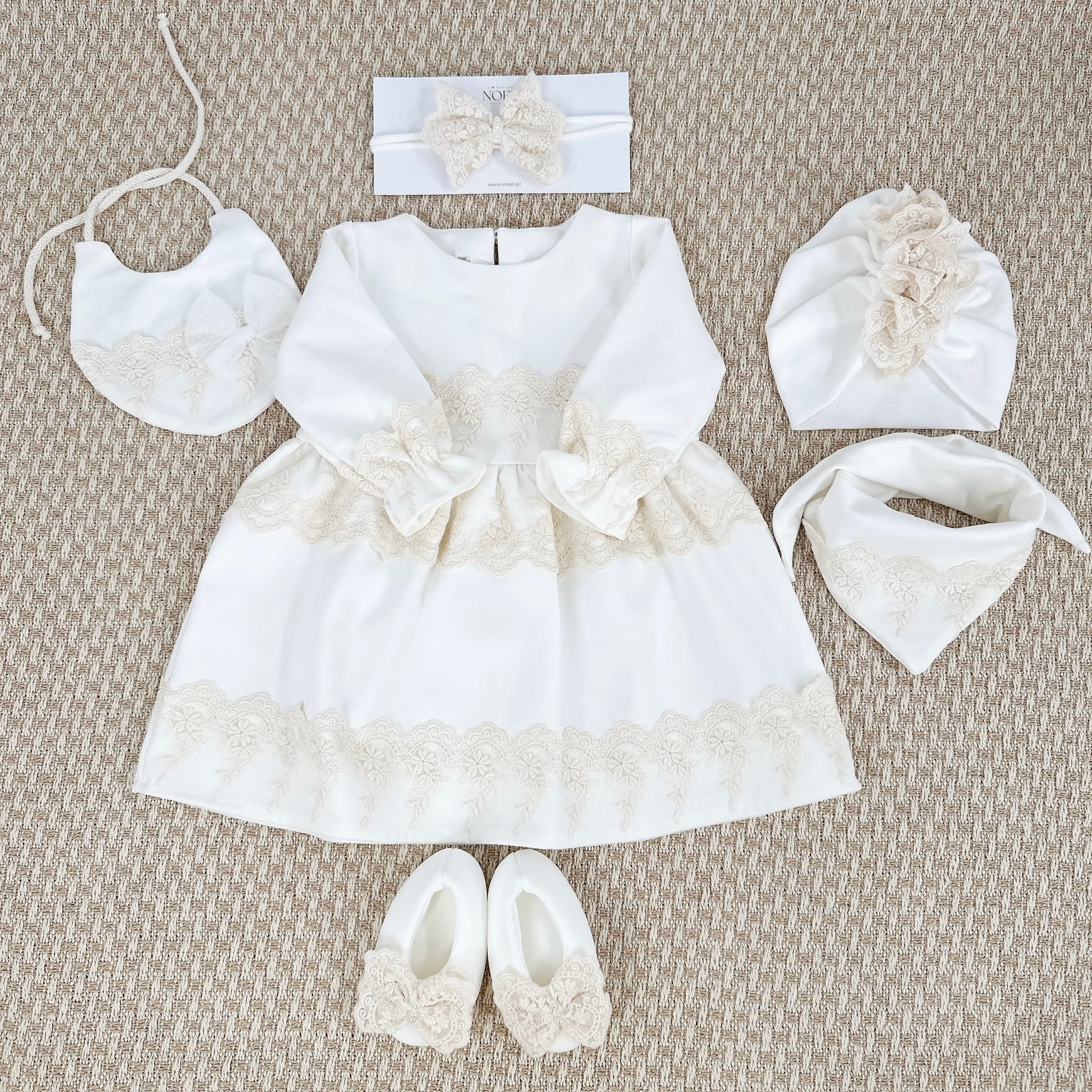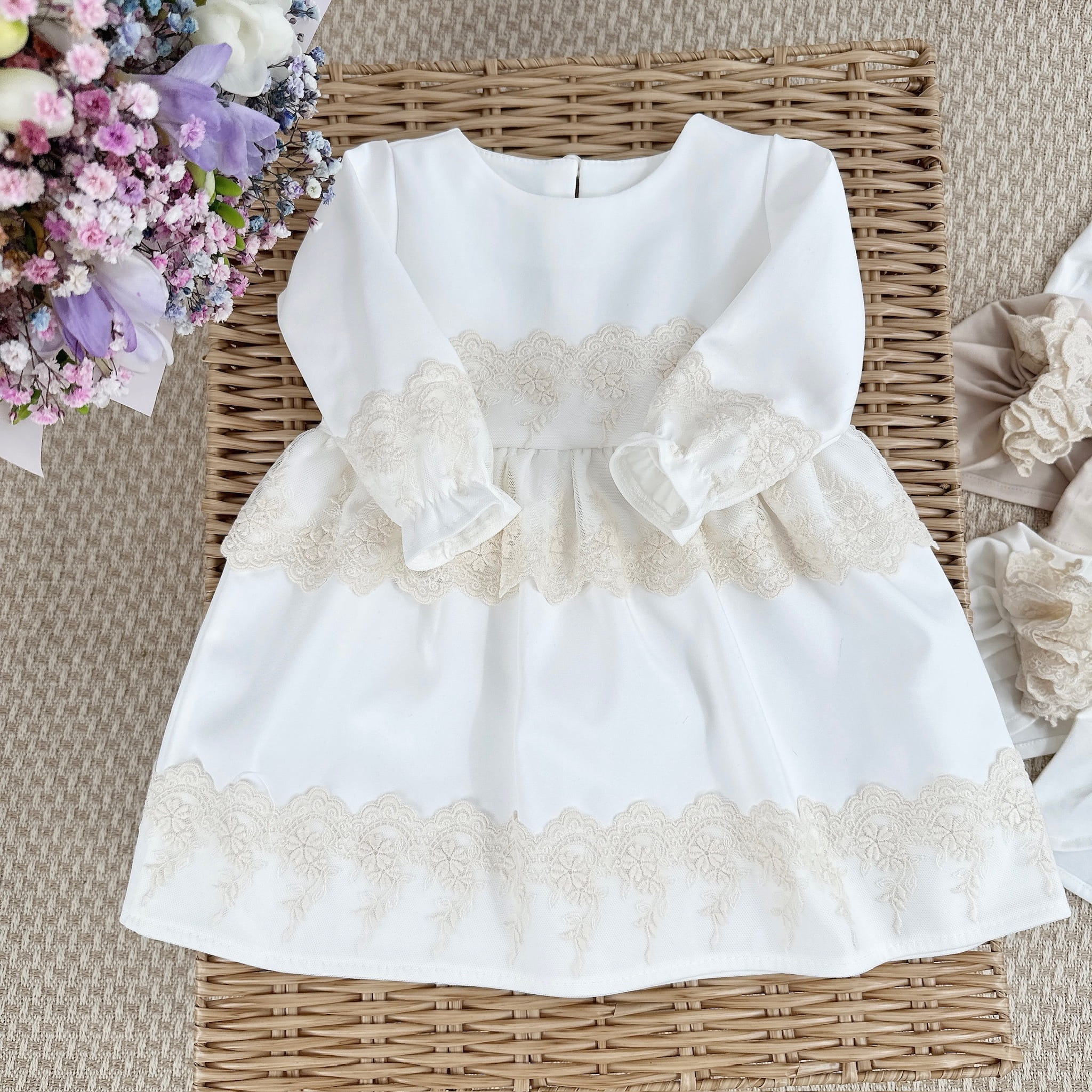 Sukienka do chrztu Matylda ecru zdobiona delikatnym tiulowym haftem beżowym, wykonana z matowej szlachetnej bawełny premium lekko rozciagliwej, zapinana na guziczek z tyłu.
