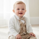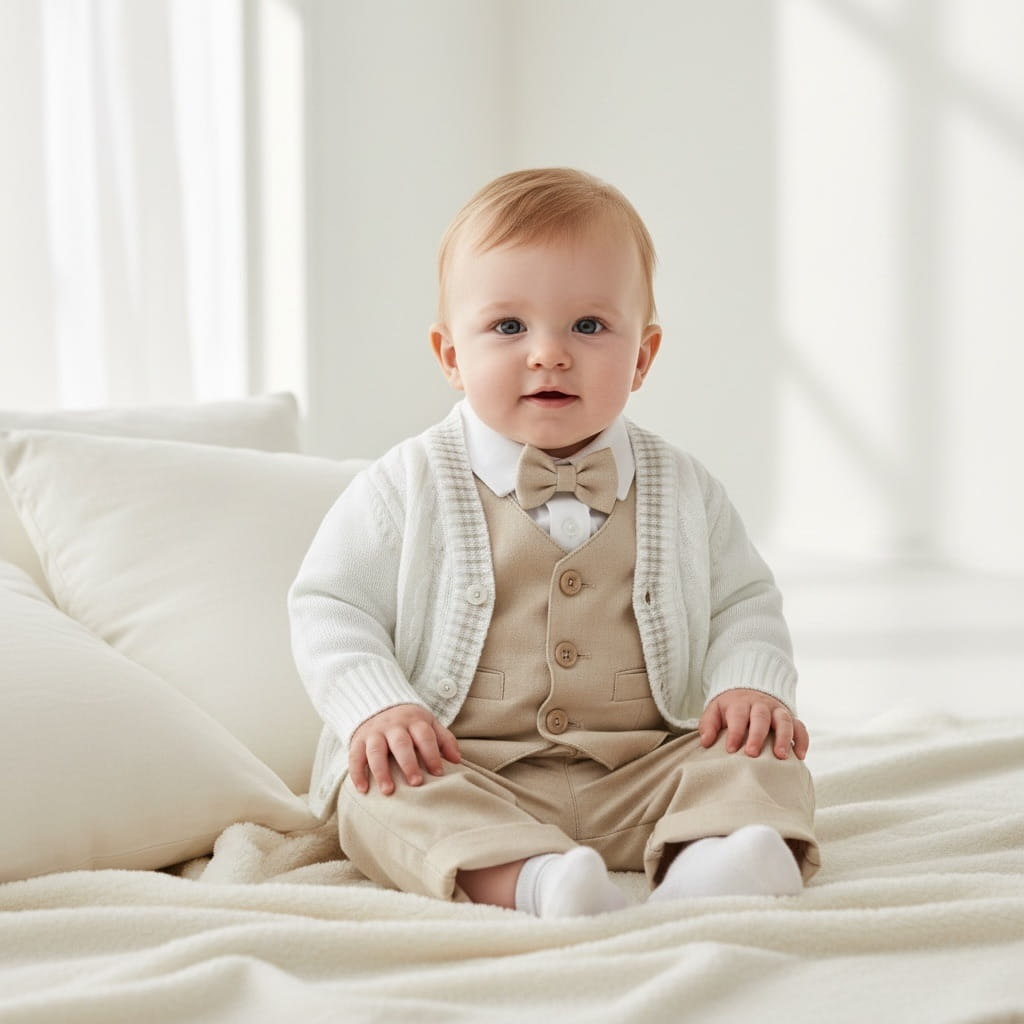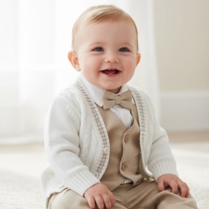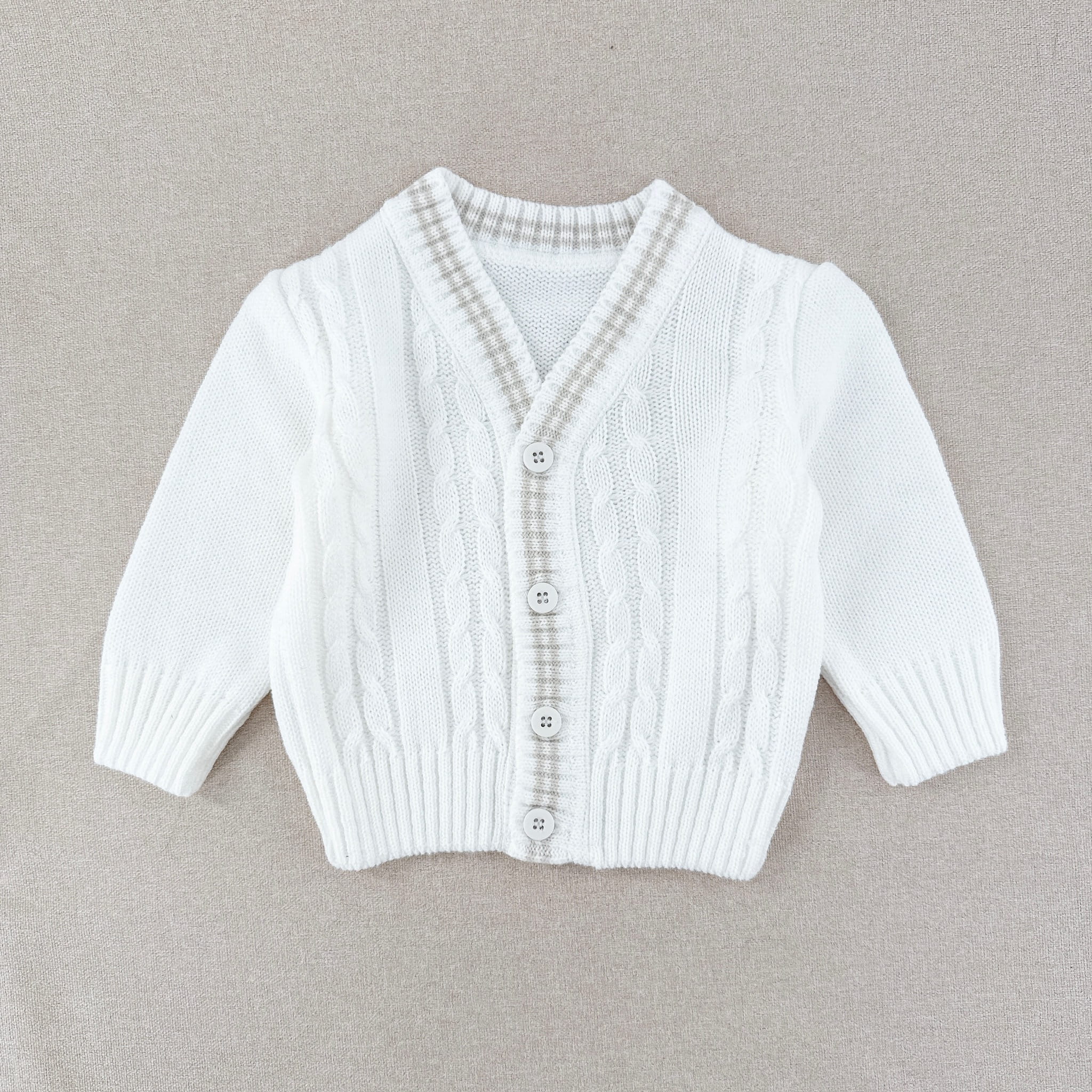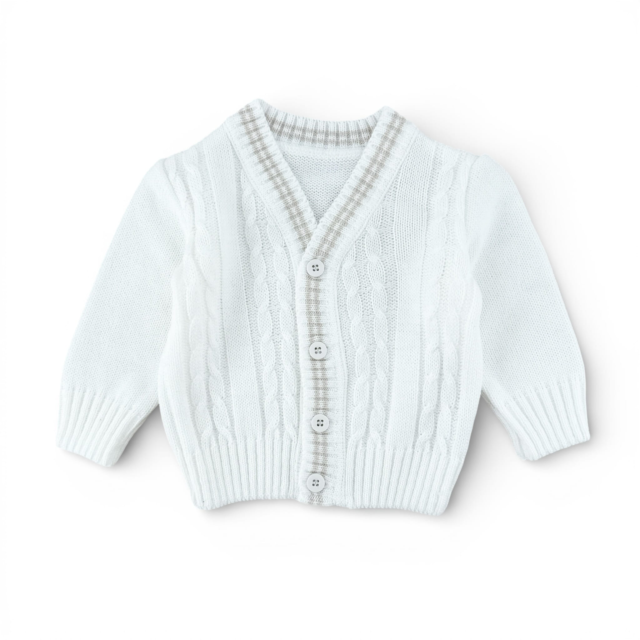 Sweterek dla chłopca ecru dziergany z warkoczem, w serek, zapinany na guziki, mięciutki, z warkoczami, ozdobiony paskami piaskowy beż , wyprodukowany w Polsce.