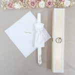Szatka krzyżmo biała z personalizacją i zdobiona świeca do Chrztu w pudełku