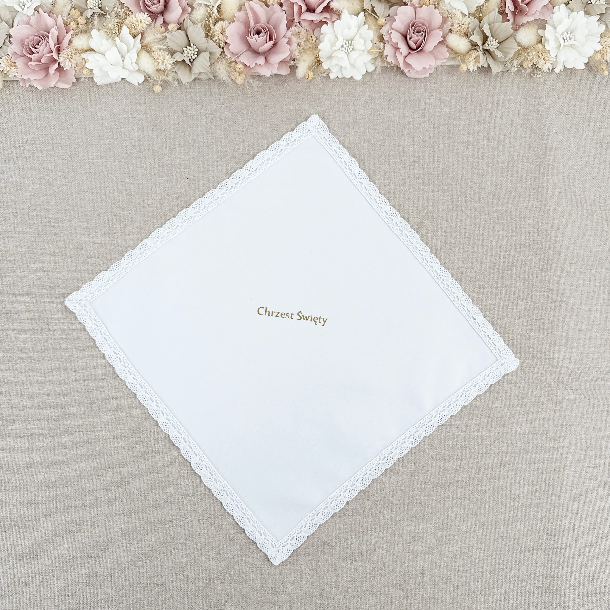 Szatka do Chrztu kwadrat w kolorze białym z tkaniny bawelnianej premium, obszyta delikatną bawełnianą koronką, rozmiar 28x28cm ozdobiona złotym nadrukiem z dowolną treścią, którą prosimy zamieścić w komentarzu w koszyku