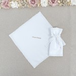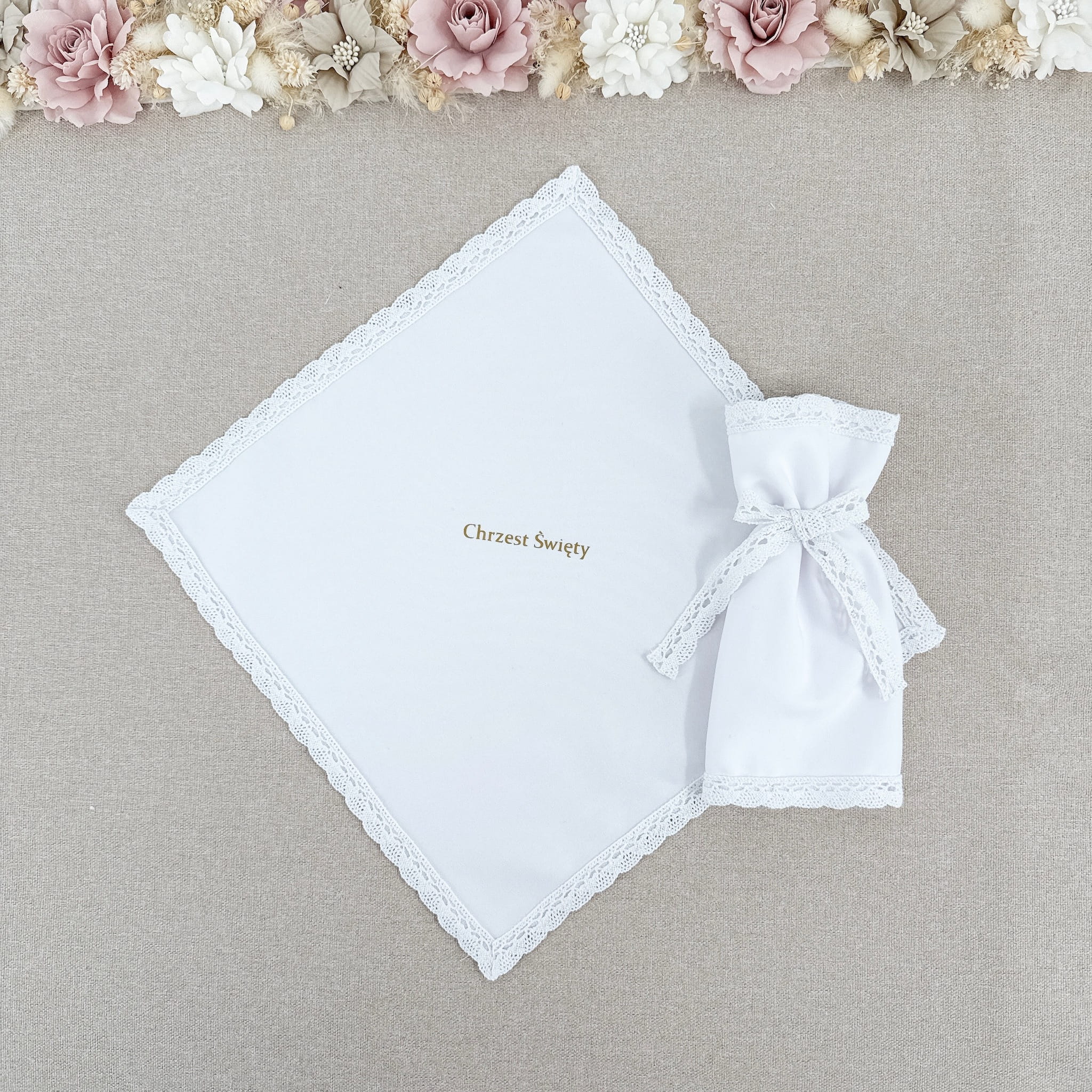 Szatka do Chrztu kwadrat w kolorze białym z tkaniny bawelnianej premium, obszyta delikatną bawełnianą koronką, rozmiar 28x28cm ozdobiona złotym nadrukiem z dowolną treścią, którą prosimy zamieścić w komentarzu w koszyku, w zestawie z profitką na świecę z tej samej koronki.