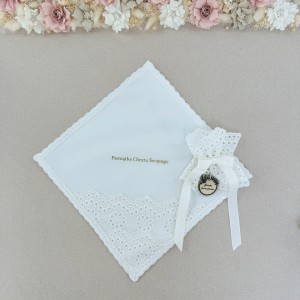 Szatka krzyżmo do Chrztu ecru Chrzest Święty z personalizacją i angielskim haftem oraz profitka