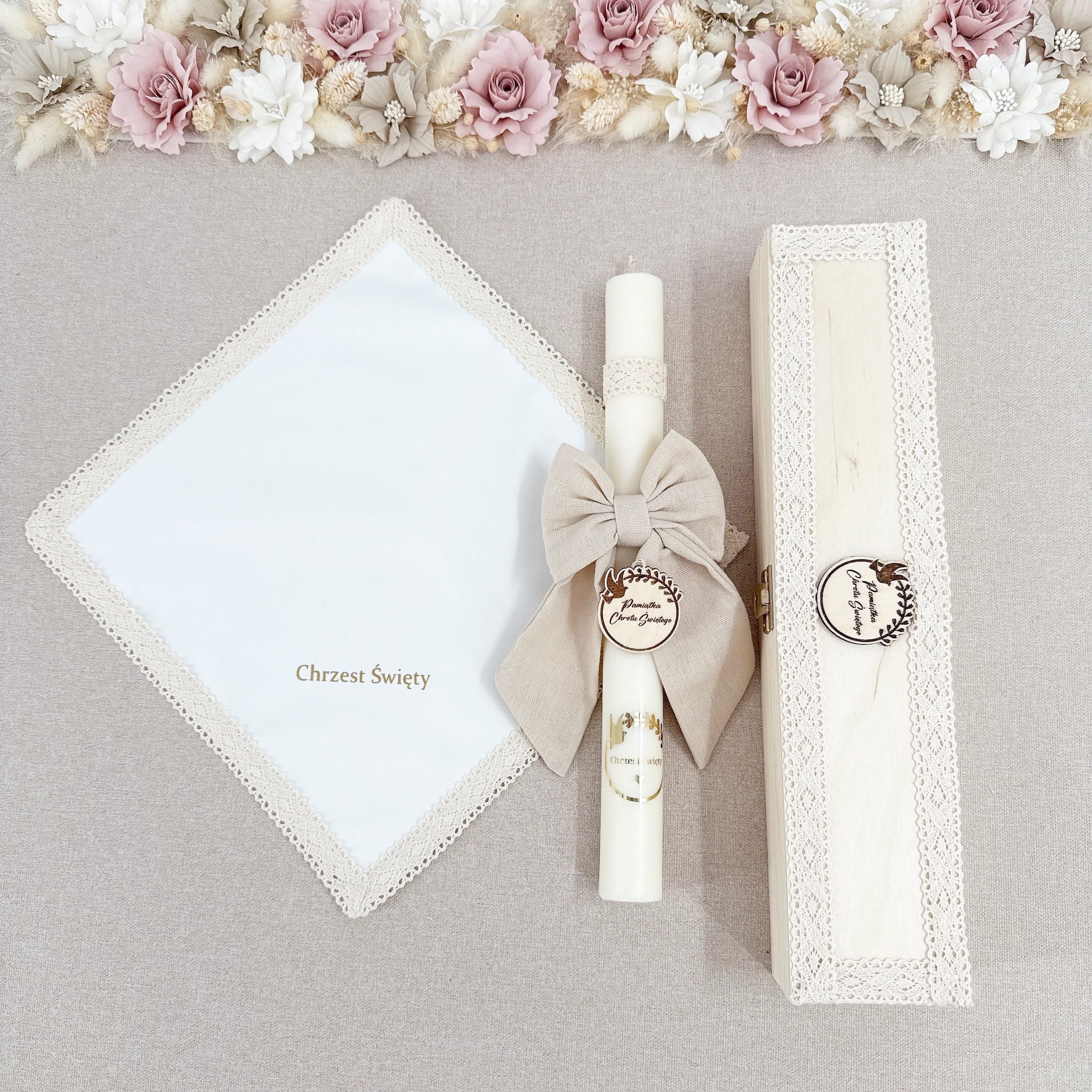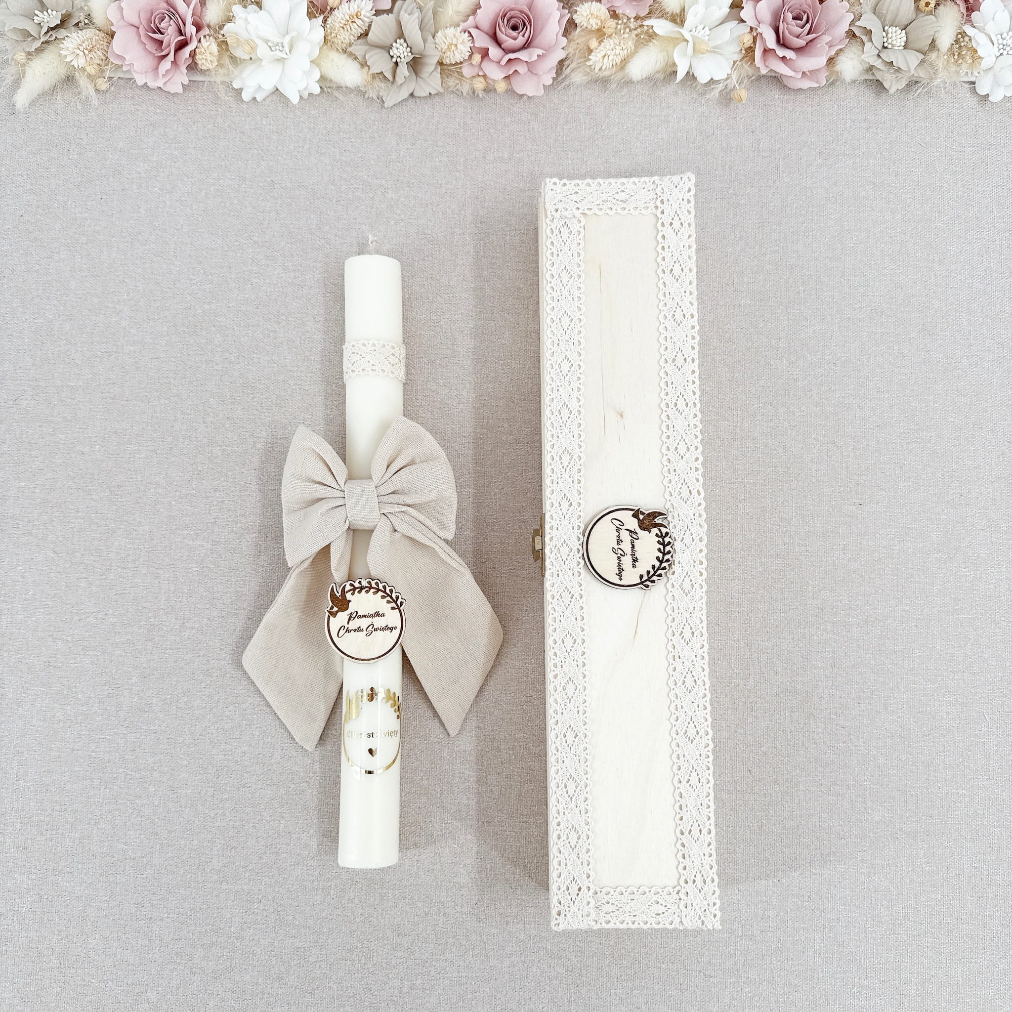 Zestaw Świeca do Chrztu sojowa naturalna zdobiona kokardą z lnu koronką beżową oraz szatka z personalizacja i okapnikiem w drewnianym pudełku