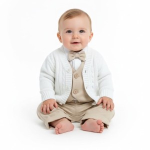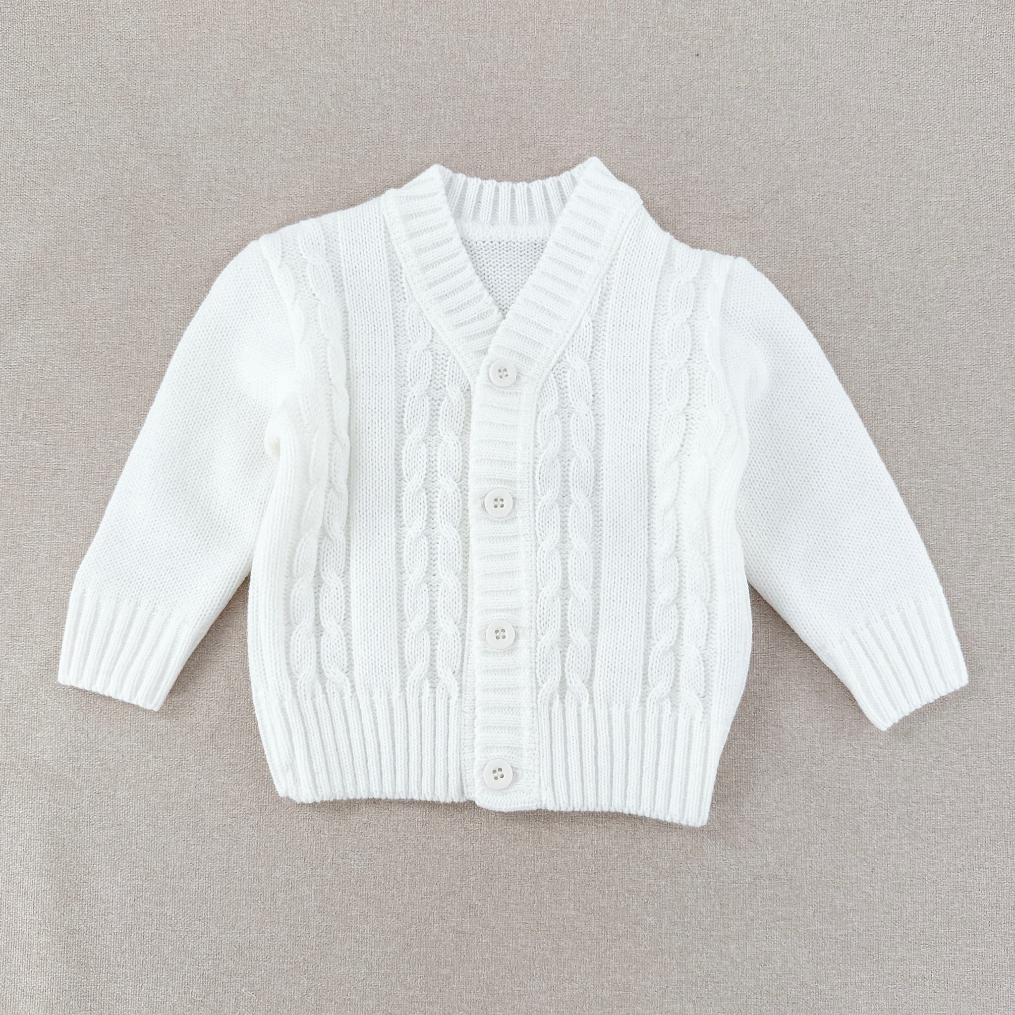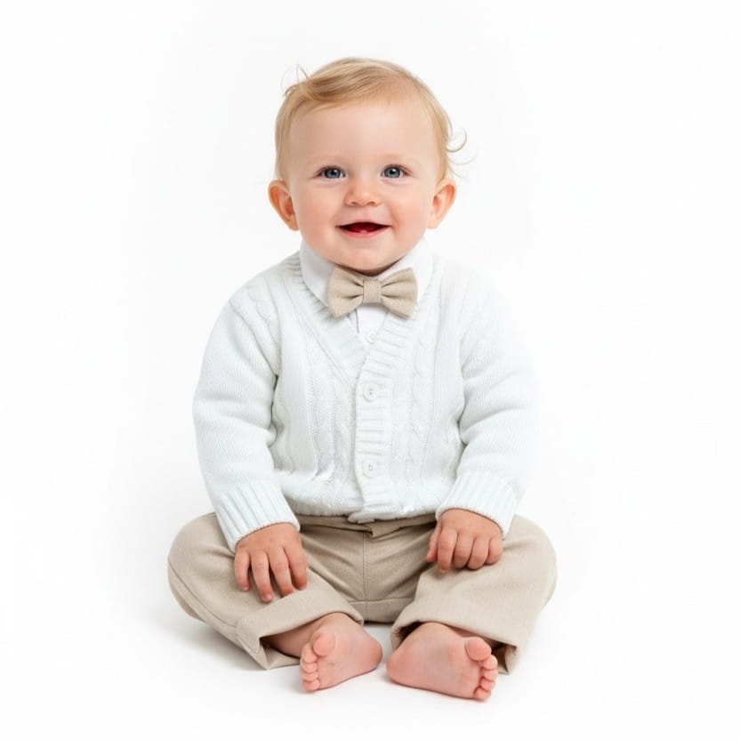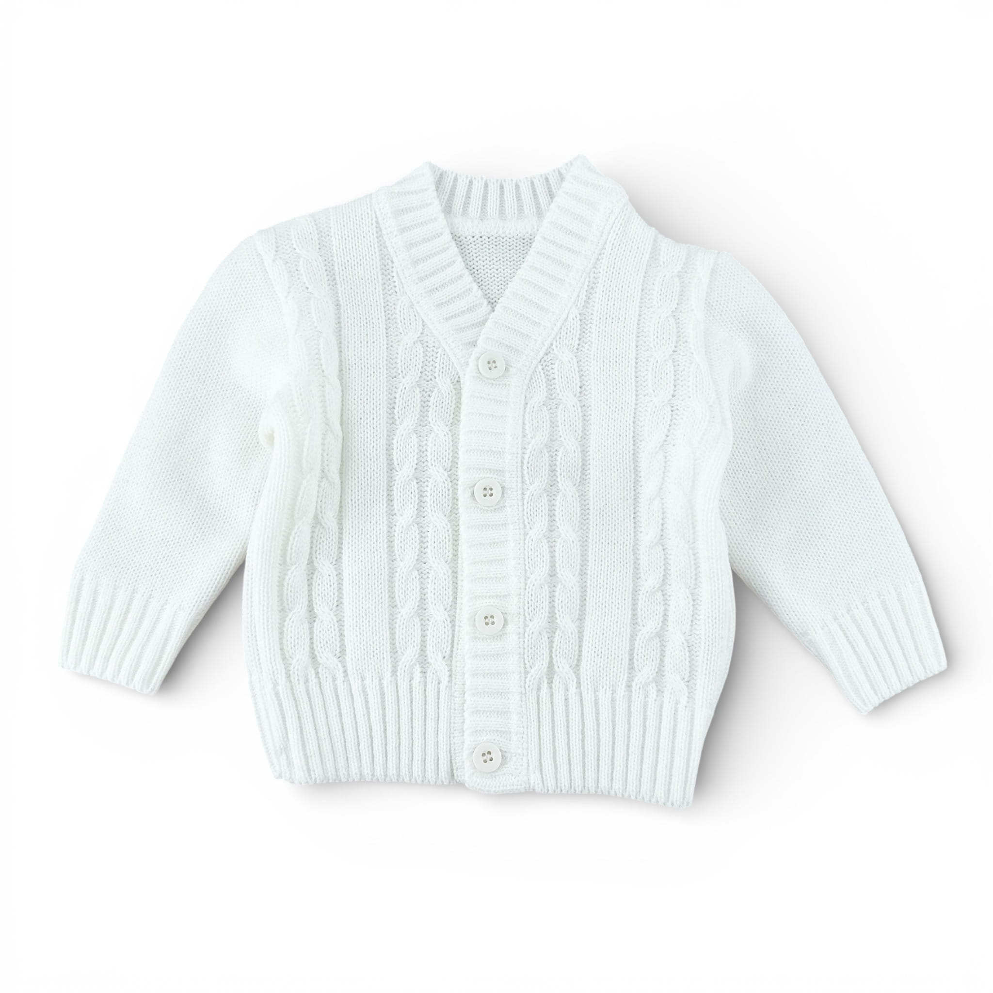 Sweterek dla chłopca ecru dziergany z warkoczem, w serek, zapinany na guziki, mięciutki, z warkoczami,wyprodukowany w Polsce.